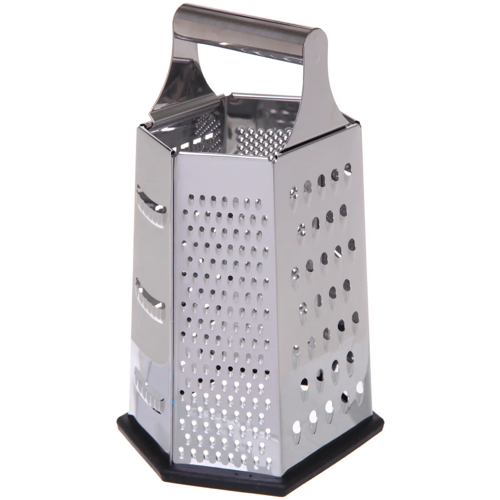 Терка имеет шестиугольную форму и 6 сторон с различными типами отверстий, что позволяет натирать овощи на крупной, средней и мелкой терке, а также нарезать их на ломтики. Силиконовое основание предотвращает скольжение, обеспечивая безопасность во время использования. Она идеально подходит для нарезки овощей, сыра и других продуктов, что делает её универсальным инструментом для приготовления блюд.