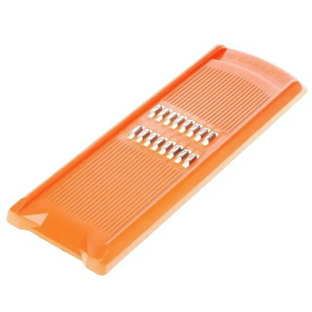 Размеры терки составляют 27,5 см в длину, 8,7 см в ширину и 1,6 см в высоту, что делает ее компактной и удобной для хранения. Яркий оранжевый цвет добавляет радости в процесс готовки, а рифленая поверхность обеспечивает качественную нарезку. Не упустите возможность сделать процесс приготовления более приятным и эффективным!
