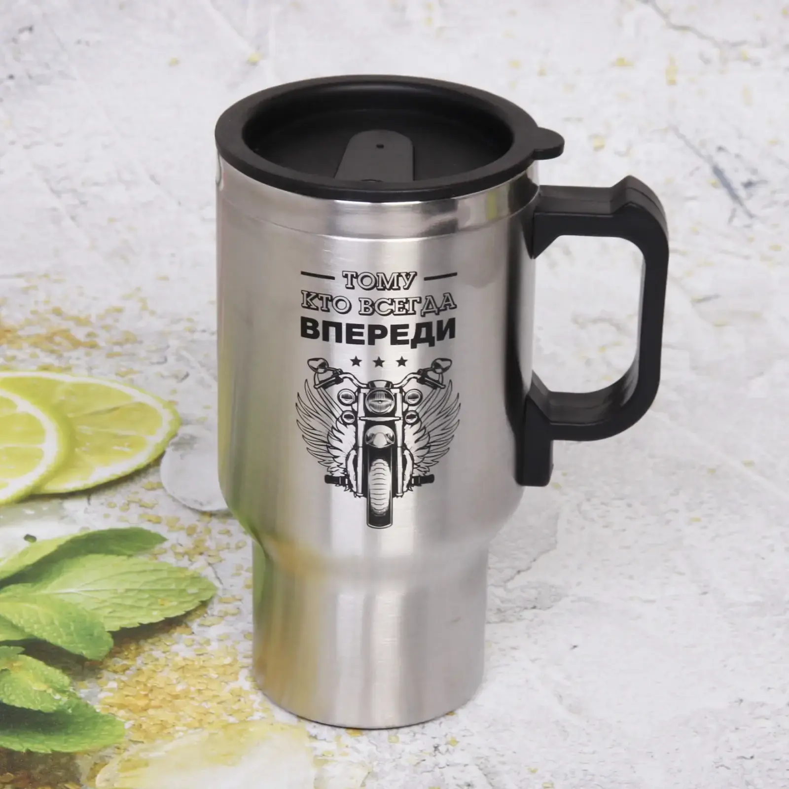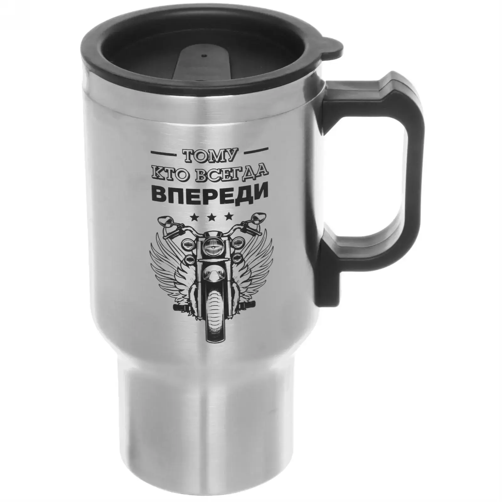 Представляем вам термокружку объемом 450 мл, которая станет вашим незаменимым спутником в поездках. С подогревом от прикуривателя, она обеспечит горячие напитки в любое время, что особенно важно для тех, кто всегда в движении. С надписью «Тому кто всегда впереди» и изображением мотоцикла с крыльями, эта кружка не только функциональна, но и стильна.