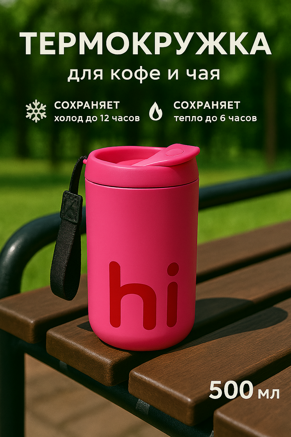 Представьте: горячий кофе остается теплым даже через несколько часов. Термокружка 'HI' объемом 500мл создана для тех, кто ценит комфорт и практичность в повседневной жизни.