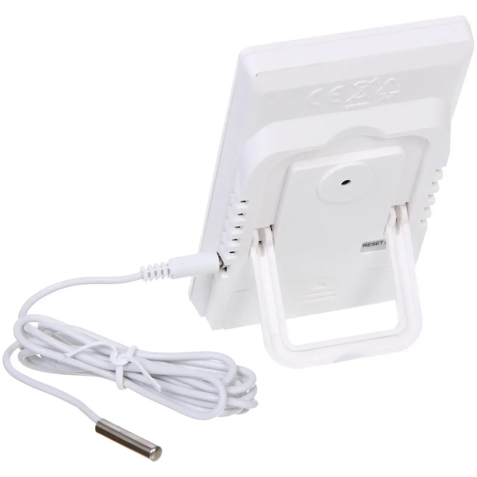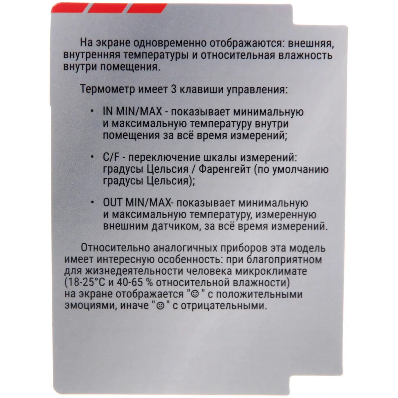 Прочный корпус из ударопрочного пластика со стеклянным экраном устойчив к перепадам температур. Длина провода с герметичным датчиком (1 м) позволяет размещать измерительный элемент в труднодоступных местах: за окном, в холодильных камерах или теплицах.