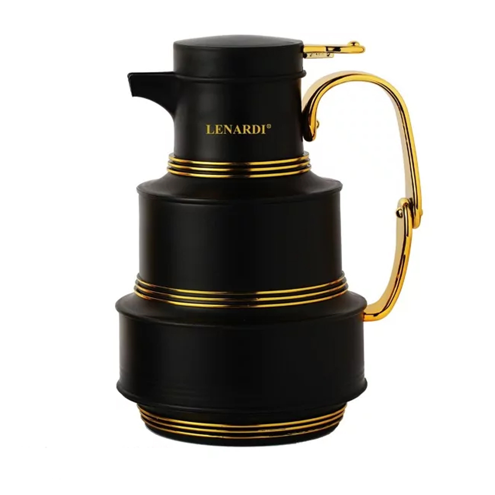 Этот термос станет вашим надежным спутником в путешествиях и на пикниках. Его стильный черный цвет с золотыми декоративными элементами придаст вашему отдыху особый шарм. Благодаря удобной ручке, вы сможете легко переносить термос, а его форма, напоминающая усеченный конус, обеспечивает комфортное использование.