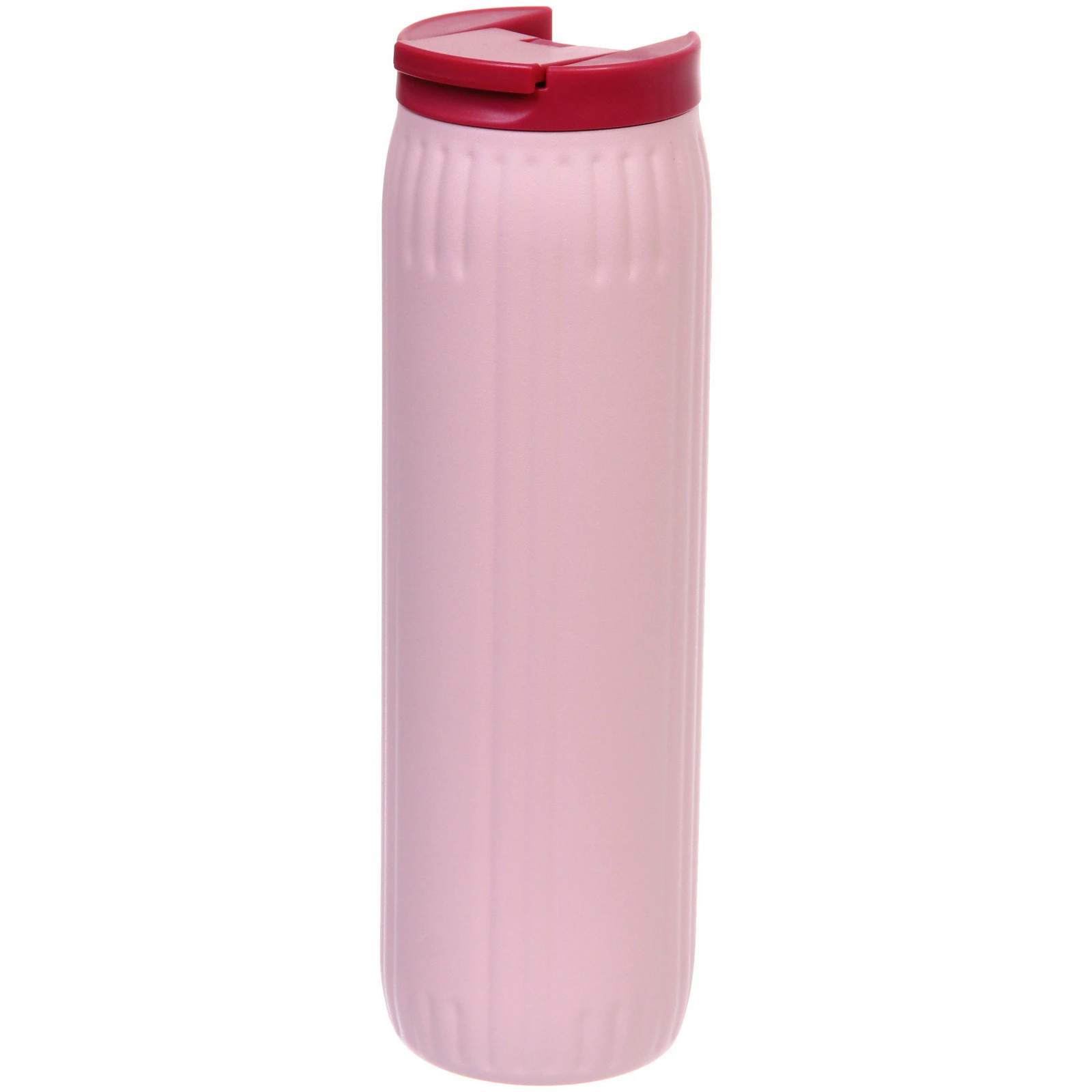 Термос 600 мл с герметичной крышкой, металл и пластик, розовый цвет, вертикальные рифления