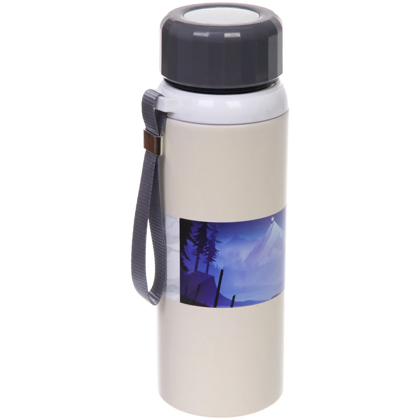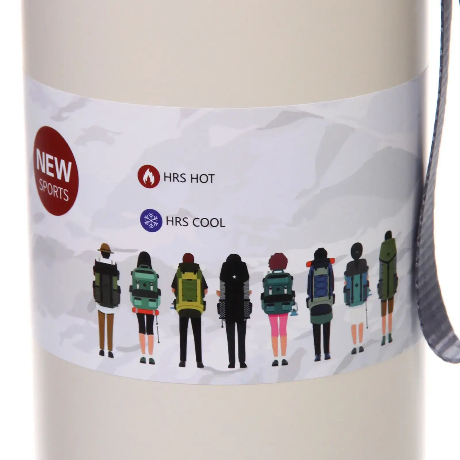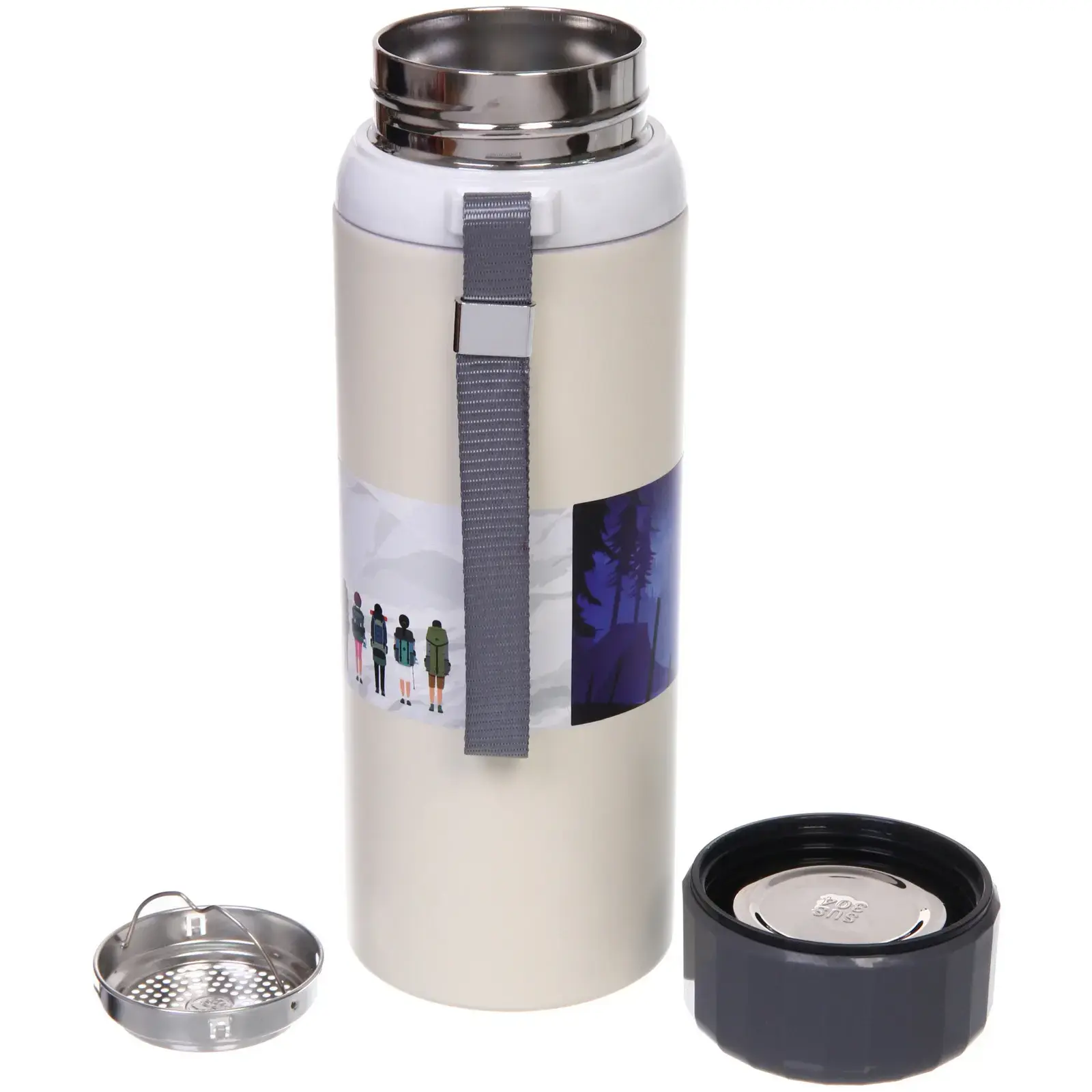 Термос имеет цилиндрическую форму и размеры, которые позволяют удобно держать его в руке. Его белый цвет с темно-серой крышкой придает ему современный вид, а наклейка с изображением гор и леса подчеркивает его связь с природой. Объем 800 мл позволяет взять с собой достаточно напитка для длительных поездок.