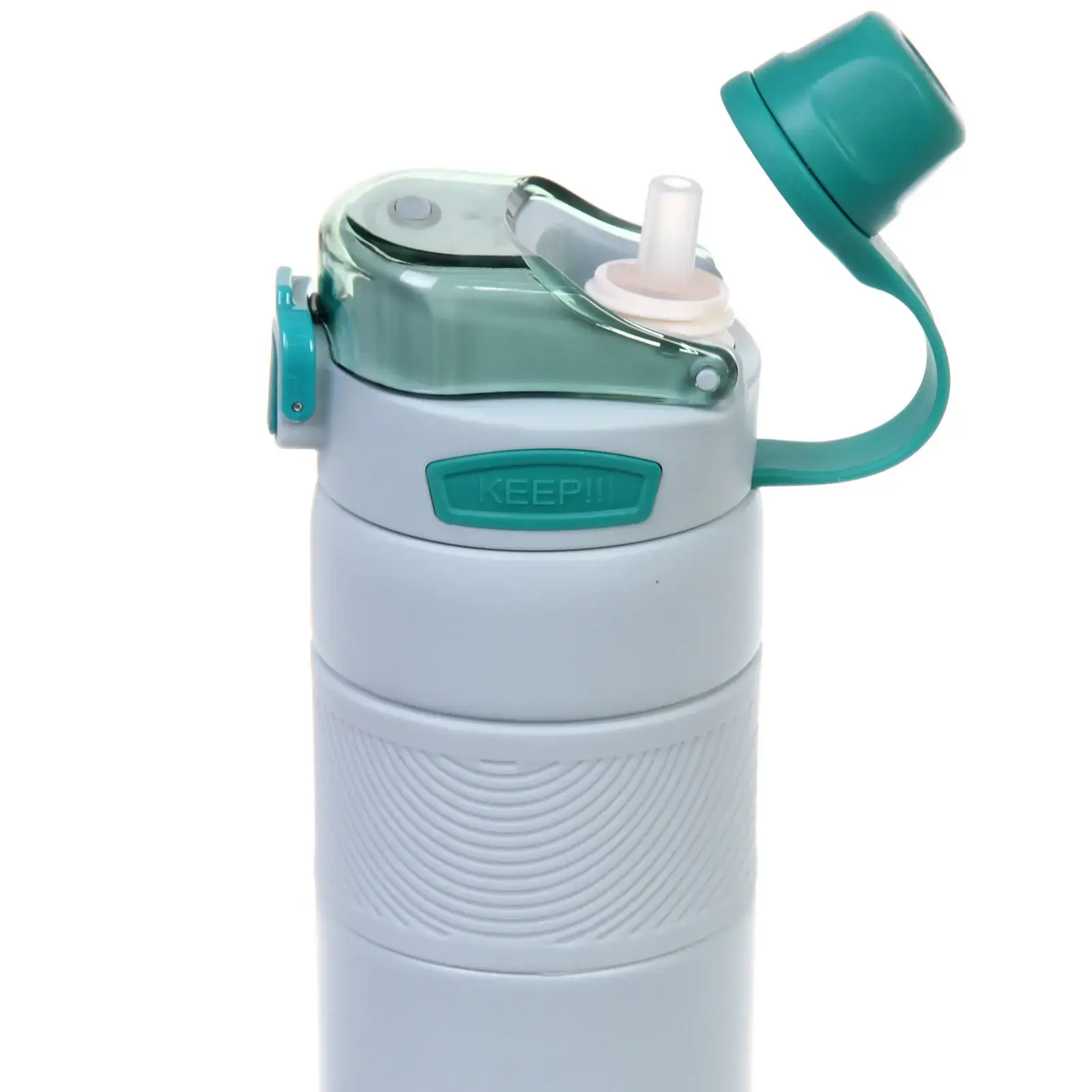 Вакуумный термос сохраняет температуру напитков до 12 часов благодаря двойным стенкам из нержавеющей стали. Специальная конструкция крышки с кнопочным механизмом позволяет одним движением открывать напиток даже во время тренировки.