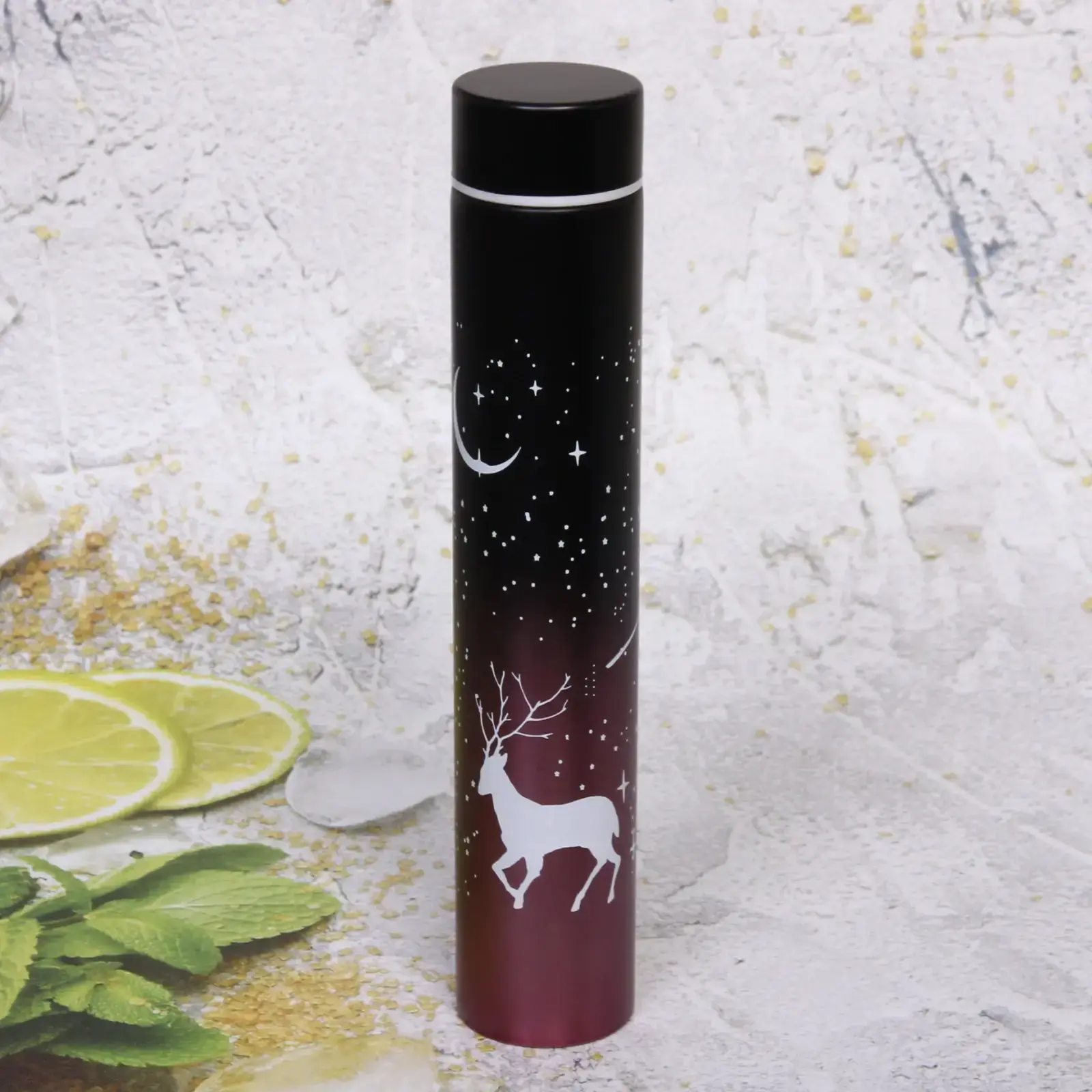 Этот компактный термос объемом 280 мл не только надежно сохраняет температуру ваших любимых напитков, но и привлекает внимание своим изысканным дизайном. Благодаря градиентному оформлению в черно-бордовых тонах и зимнему узору с оленями, звездами и луной, он станет идеальным аксессуаром для новогодних праздников и повседневного использования.