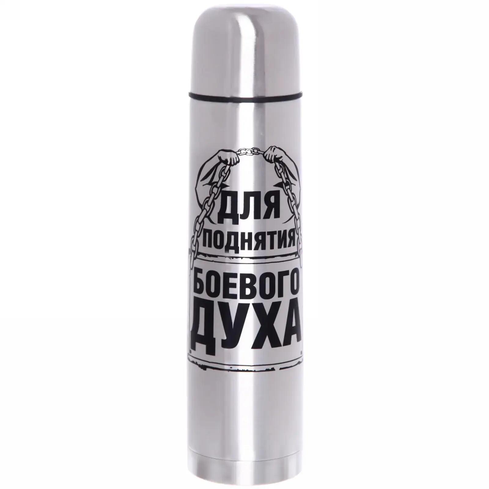 - Эстетика: блестящая поверхность и стильный принт «Для поднятия боевого духа» делают термос привлекательным.