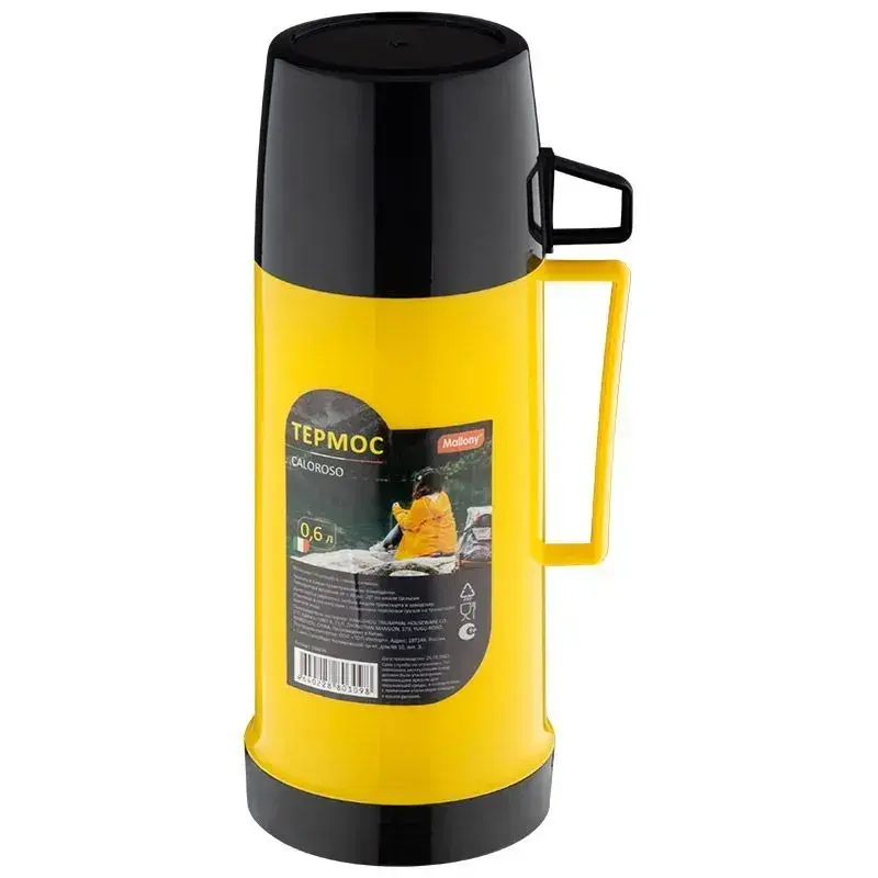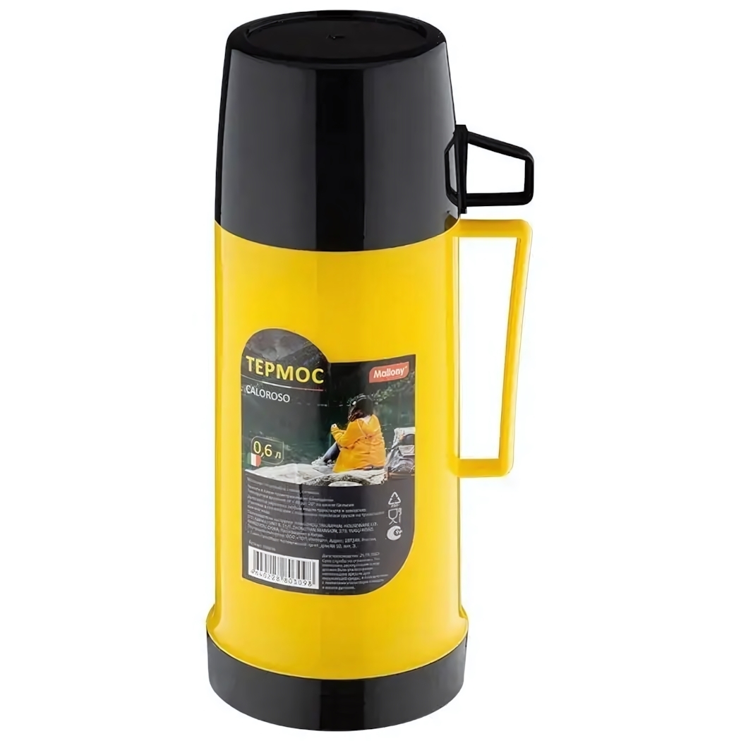 Термос "CALOROSO" со стеклянной колбой, 0,6 л, желтый с черной крышкой, пластиковый корпус