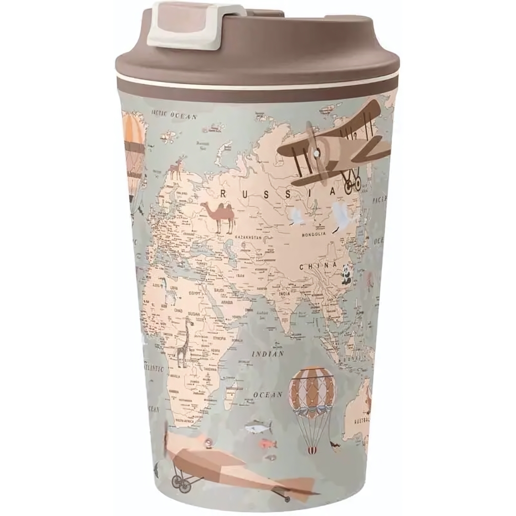 Термостакан с клапаном 350мл, декор 'Карта мира' с самолётами и животными, цвет светло-бежевый