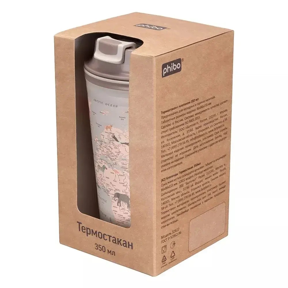Термостакан 'Карта мира' 350мл, с клапаном, цвет светло-бежевый