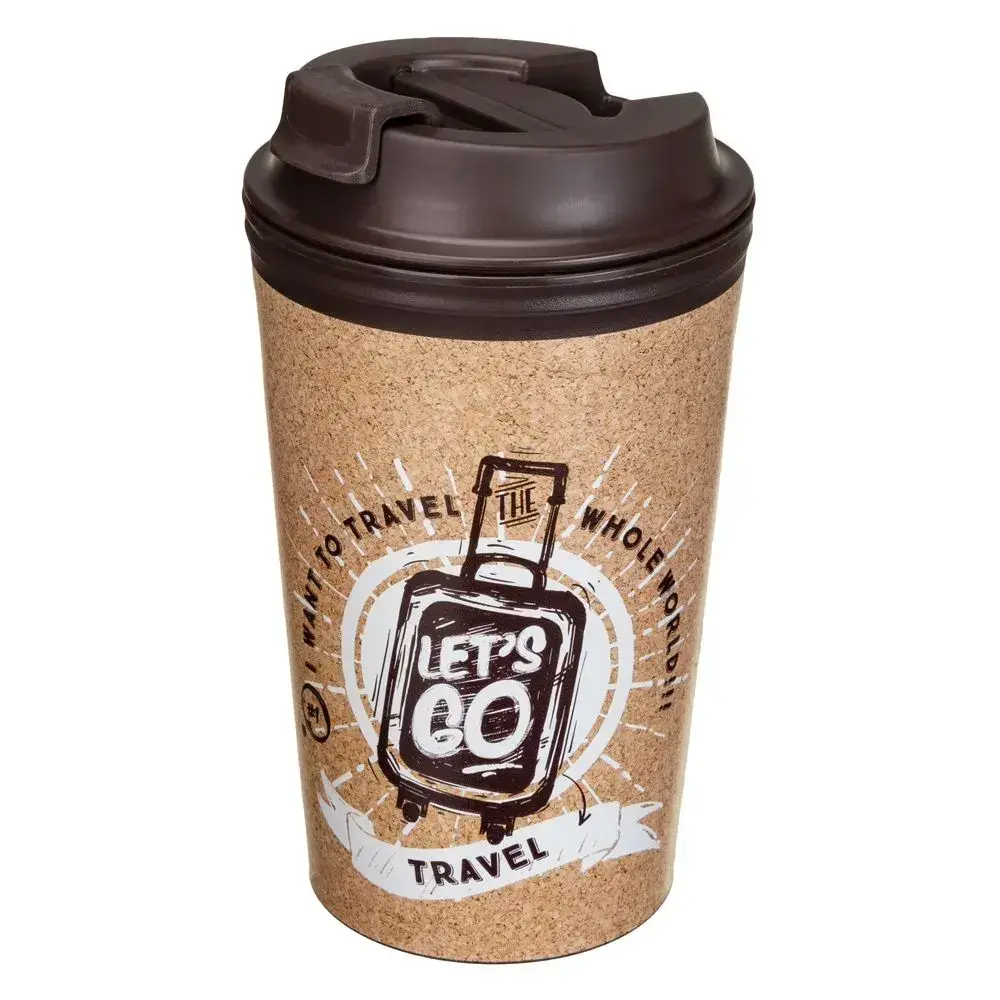 Корпус выполнен из безопасного пластика с бежево-коричневой пробковой текстурой и украшен рисунком чемодана и надписями "LET'S GO", "TRAVEL". Объем термостакана — 350 мл. Крышка коричневая, с клапаном и дополнительной крышечкой для питья. Яркий дизайн делает термостакан отличным подарком для любителей путешествий.