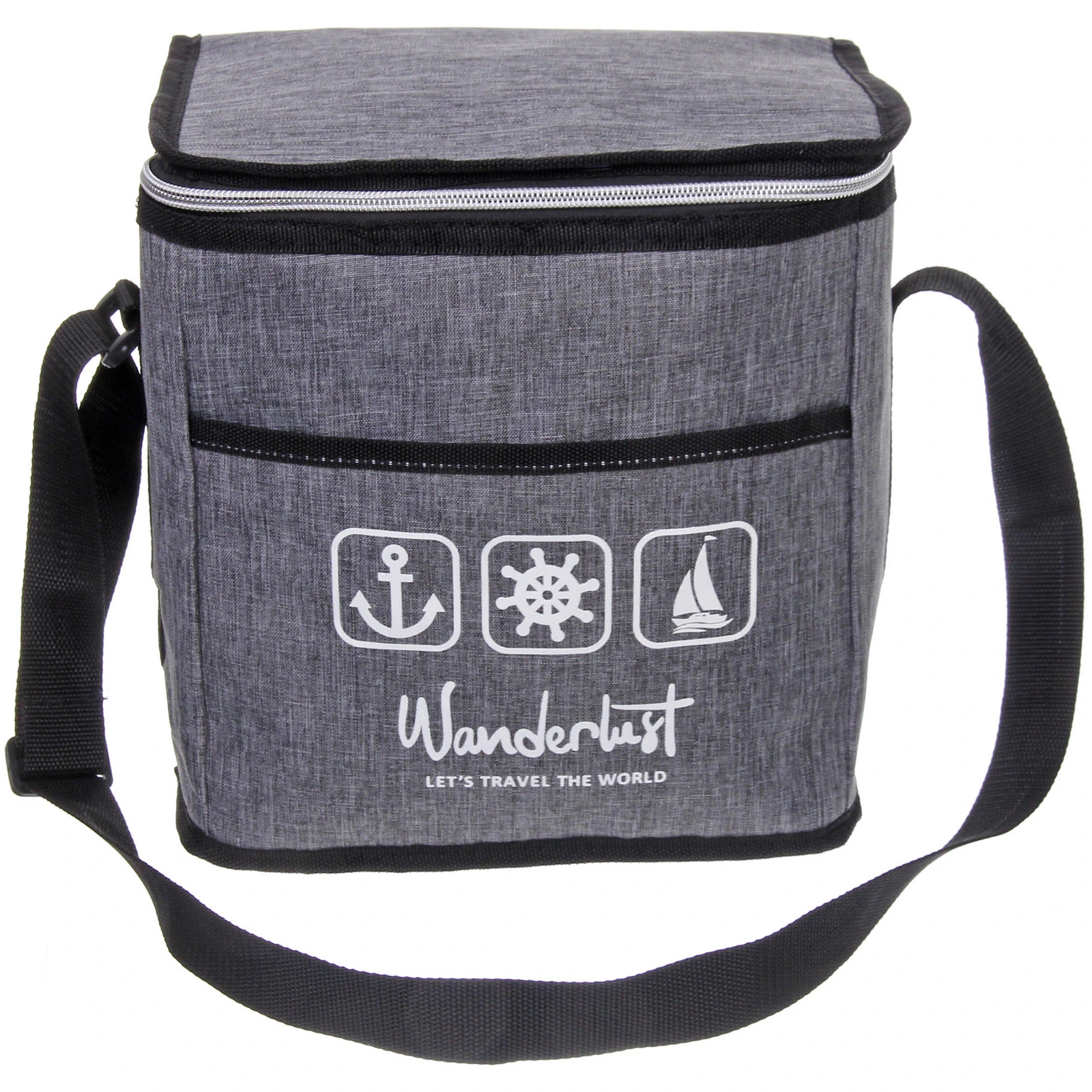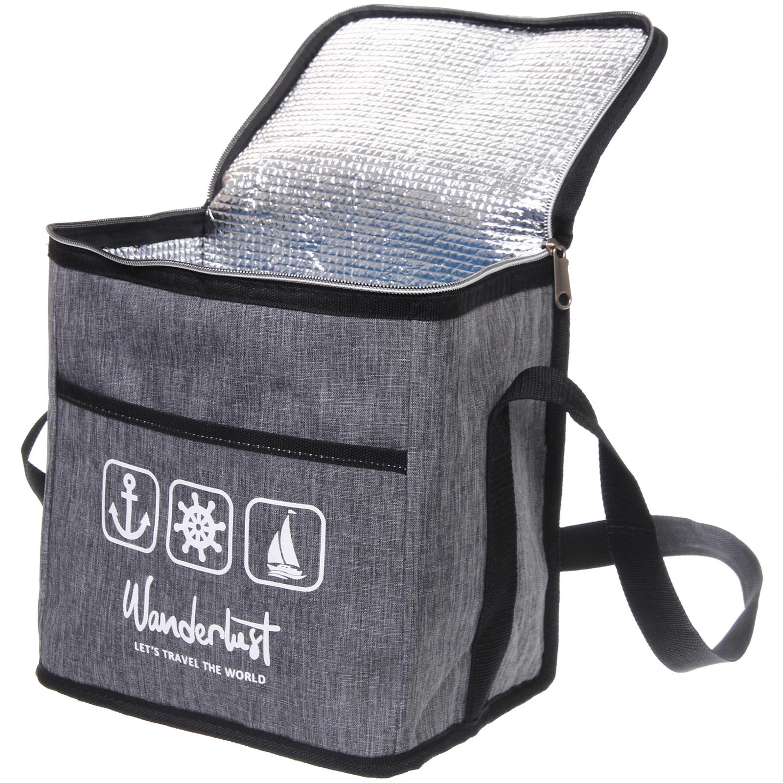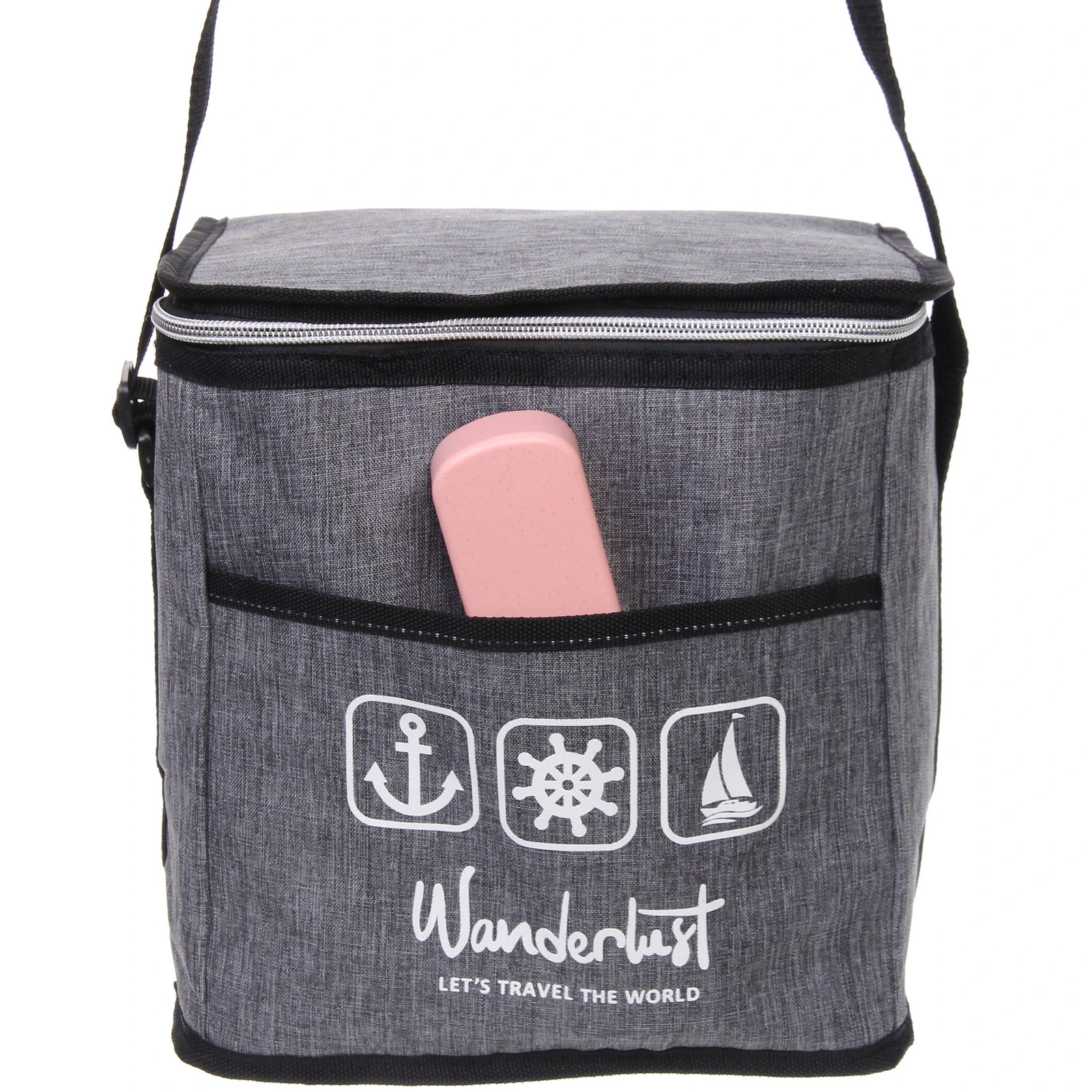 Сумка оснащена вместительным основным отделением на молнии, которое подходит для контейнеров с едой, бутылок, фруктов и перекусов. Внутренняя поверхность выполнена из материала с термоизоляционными свойствами, что способствует сохранению холода или тепла. Передний накладной карман удобен для салфеток, столовых приборов или мелких аксессуаров.