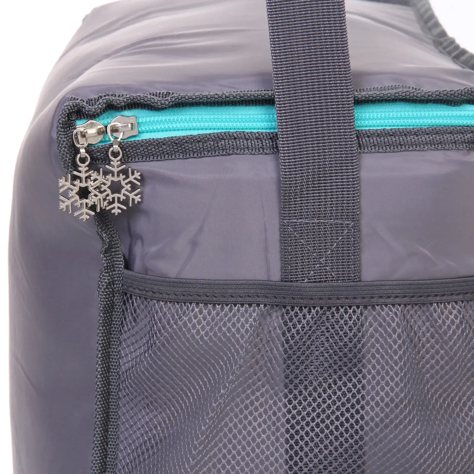 Термосумка имеет прямоугольную форму и размеры 31х20х31 см, что делает её компактной и легкой для переноски. Она оснащена длинным регулируемым ремнем и удобной ручкой, что позволяет носить её как в руке, так и на плече. Внутренняя часть сумки отделана алюминиевой фольгой, что обеспечивает отличную теплоизоляцию и позволяет сохранять холод в течение длительного времени.