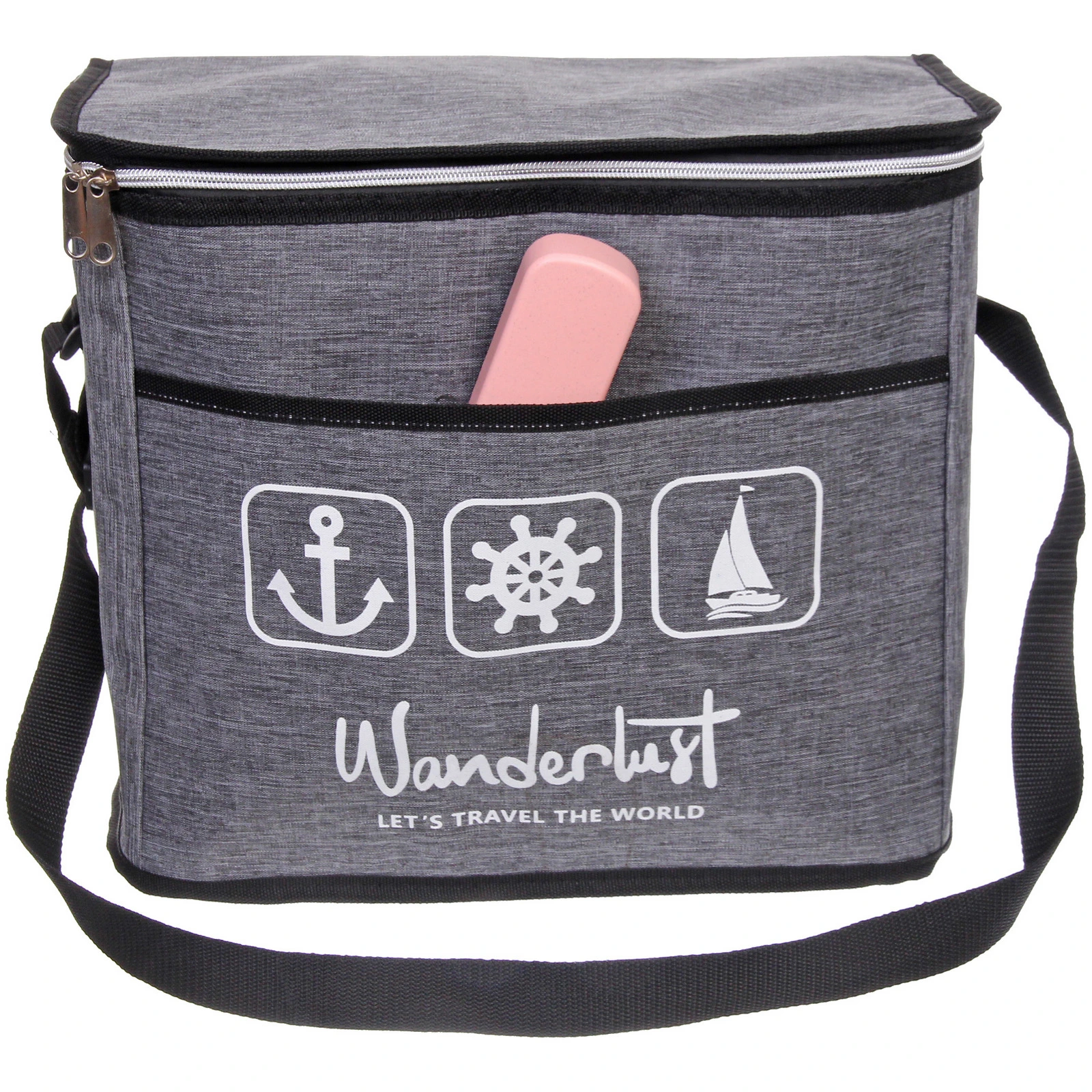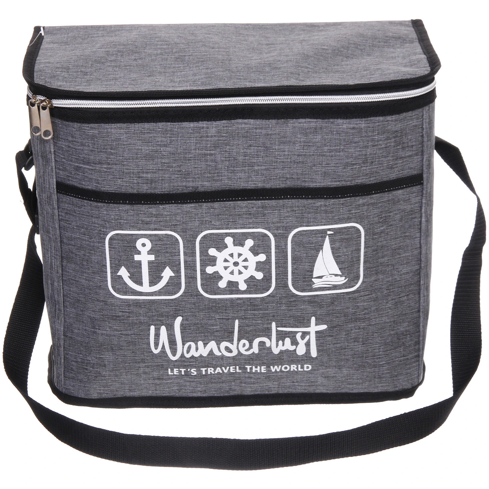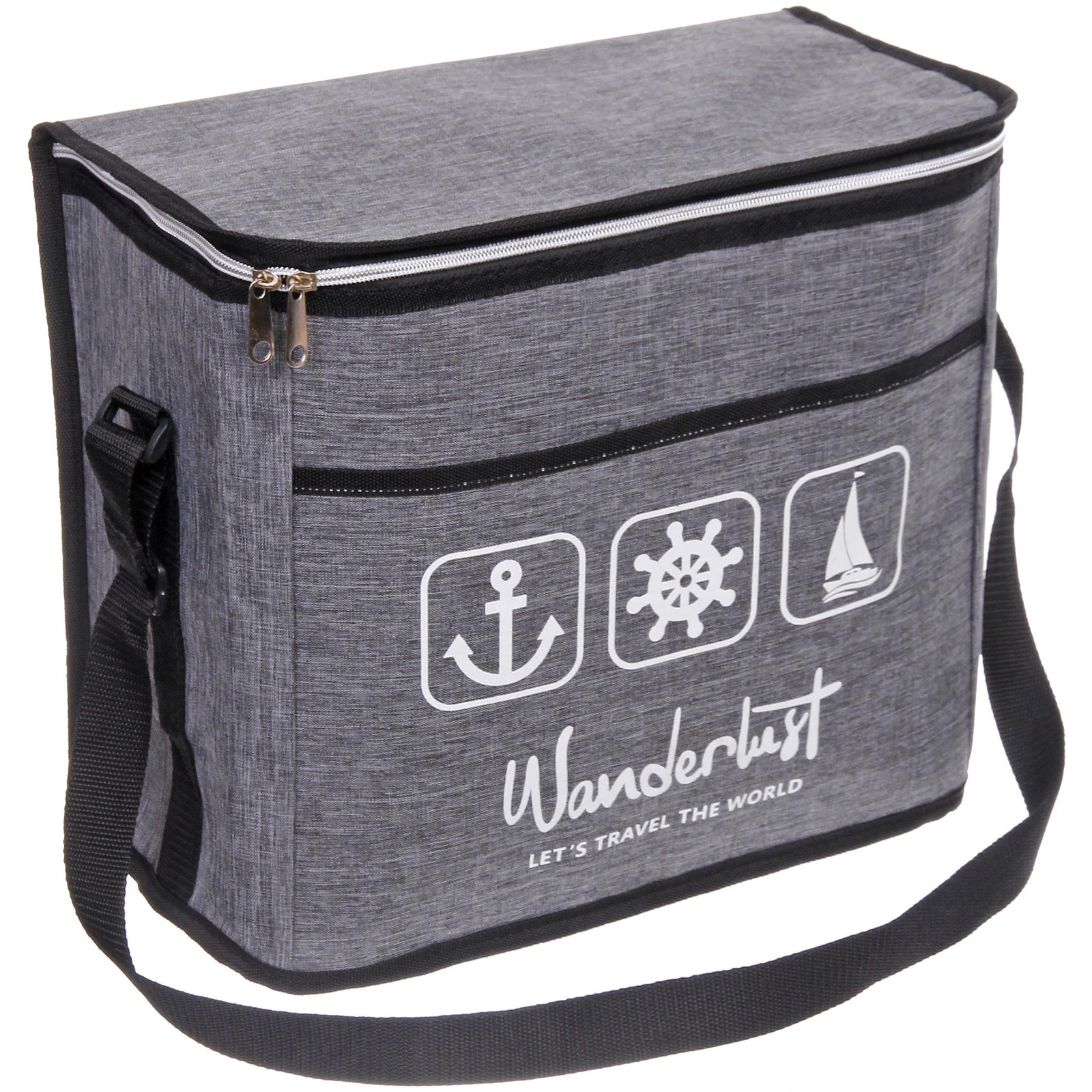 Модель изготовлена из полиэстера с элементами из полиэтилена. Ткань устойчива к повседневной нагрузке и проста в уходе. Сдержанный серый цвет с черной окантовкой и аккуратным принтом в морском стиле делает сумку уместной как для городских прогулок, так и для выездов на природу.