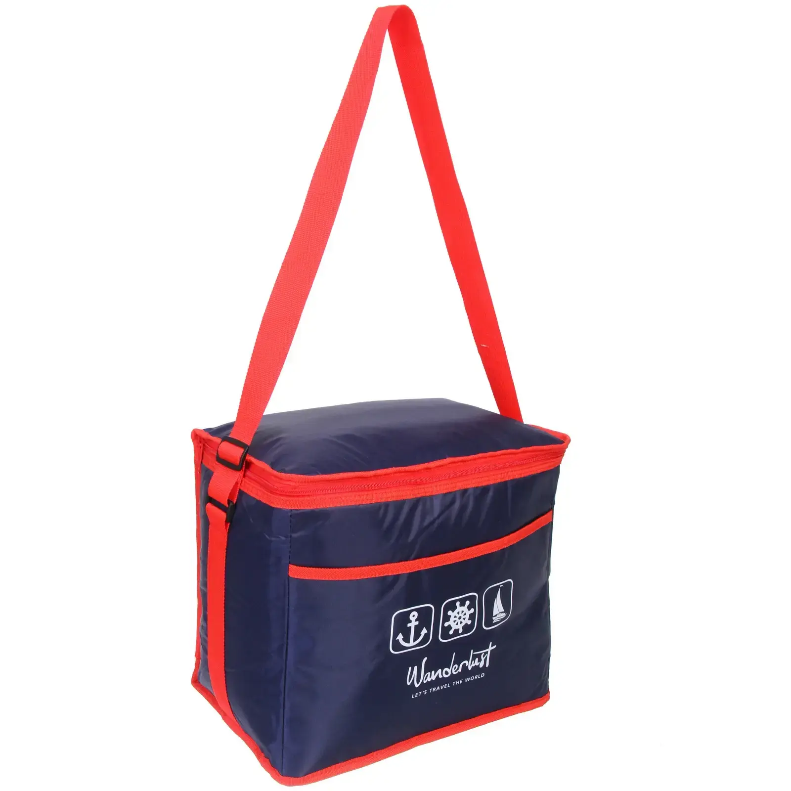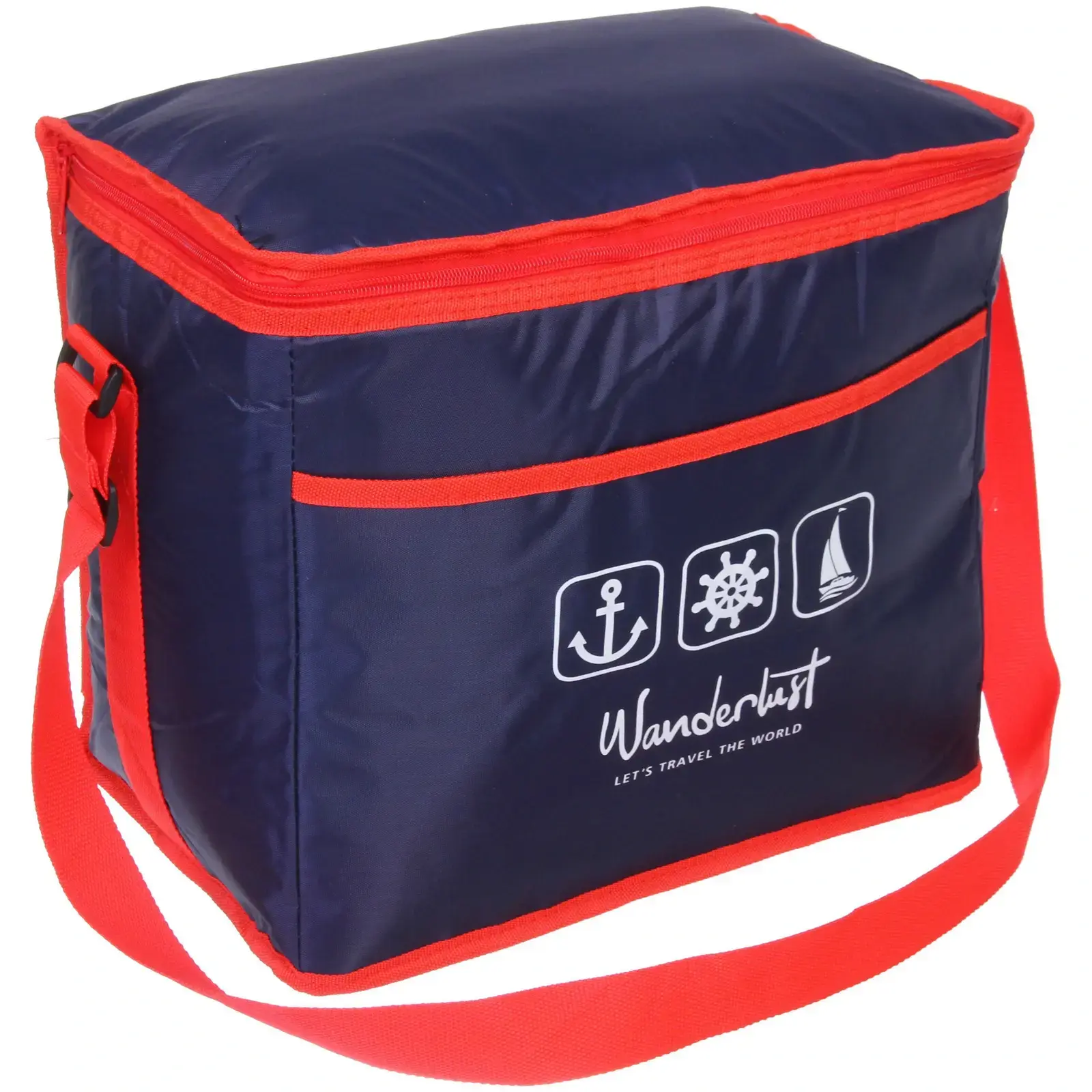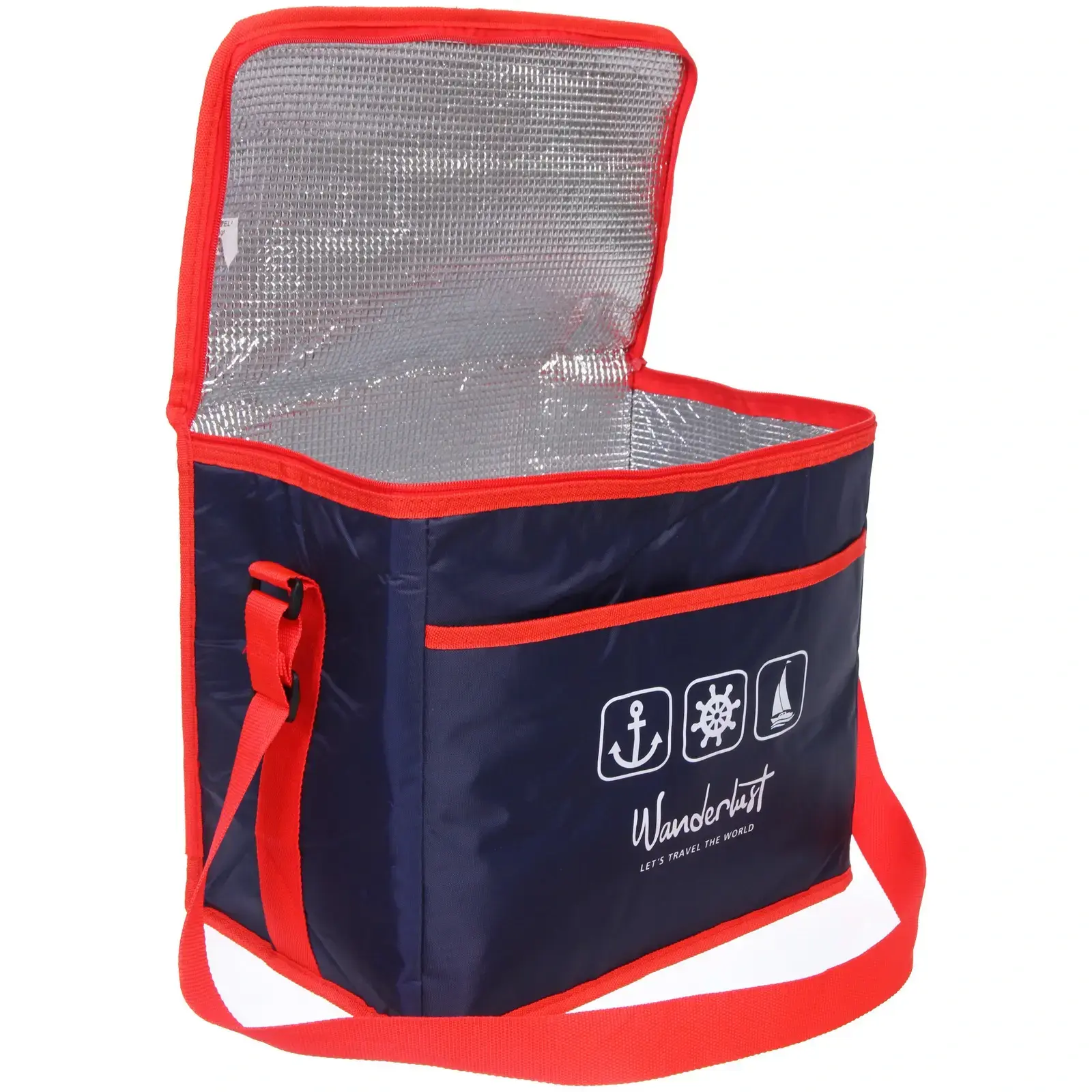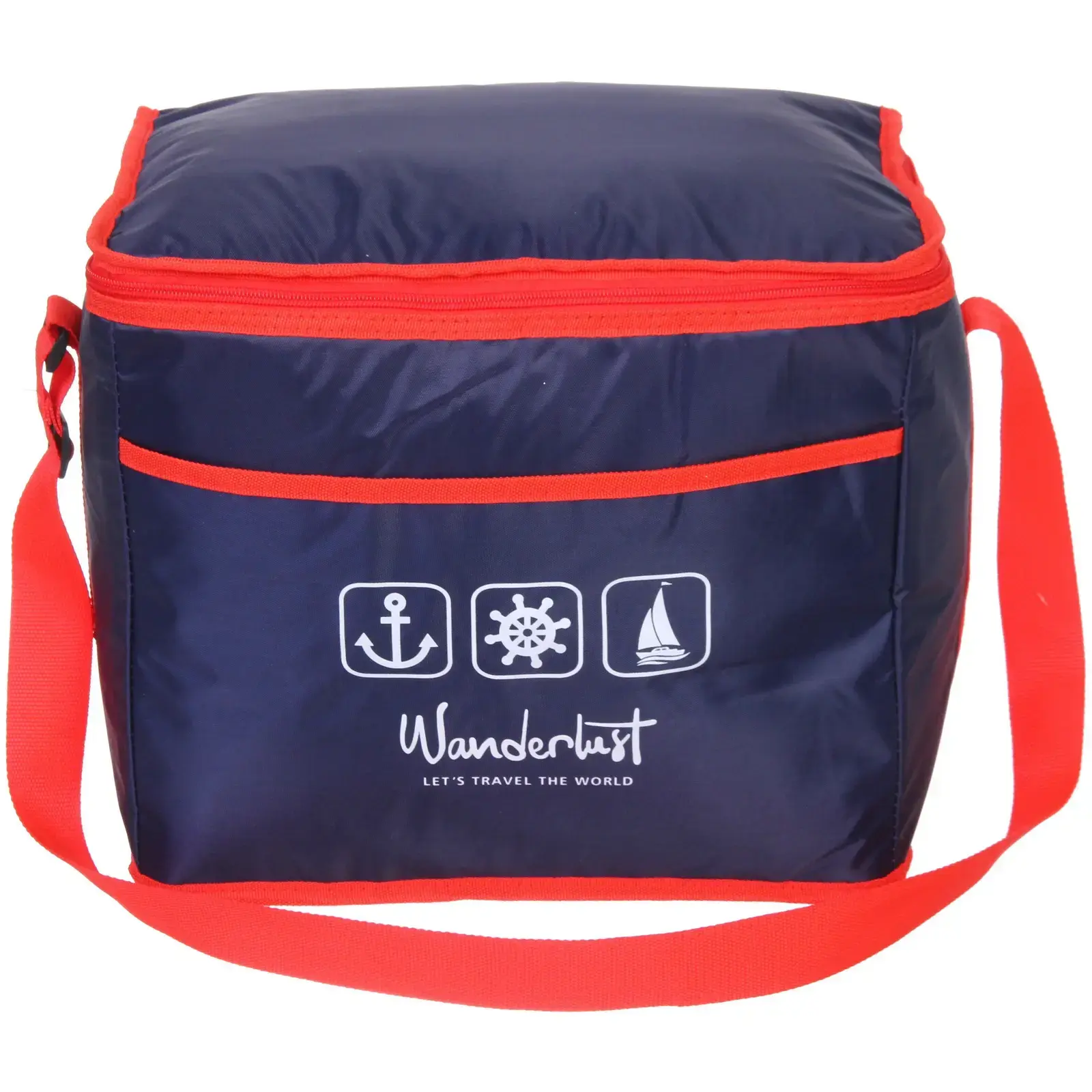 Представляем вам термосумку объемом 23 литра, которая станет незаменимым помощником в ваших путешествиях и на пикниках. С ее помощью вы сможете удобно переносить еду и напитки, сохраняя их свежими и холодными. Яркий дизайн с красными элементами и надписью 'Wanderlust' вдохновит вас на новые приключения и путешествия.