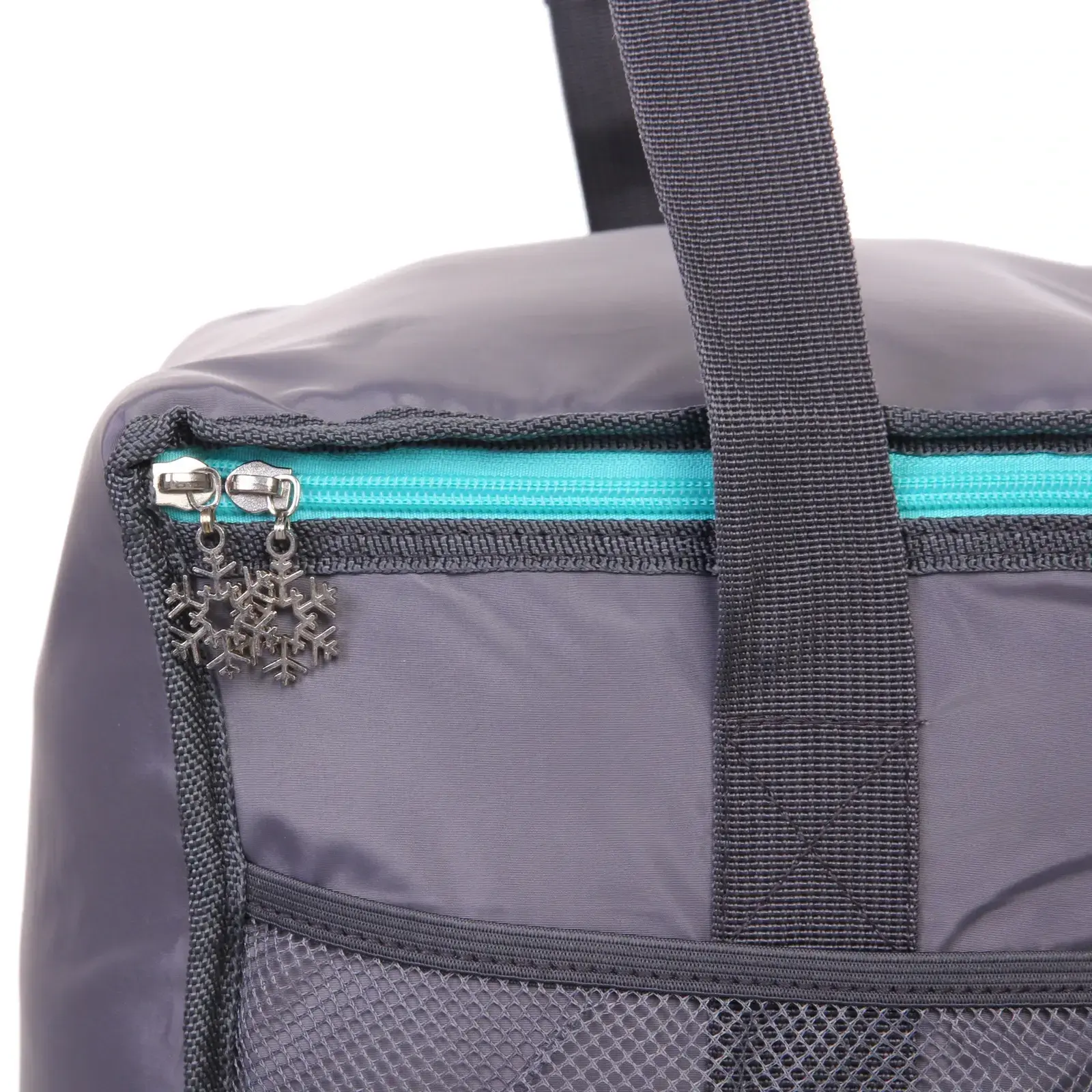Габариты сумки: 35×25×34 см. Снаружи — плотный, износостойкий текстиль (ПВХ, полиэтилен) серого цвета с бирюзовыми акцентами. Надписи и снежинки визуально подчеркивают охлаждающие свойства продукта. WELLME BAG — ваш надежный выбор для активного отдыха и заботы о свежести продуктов.