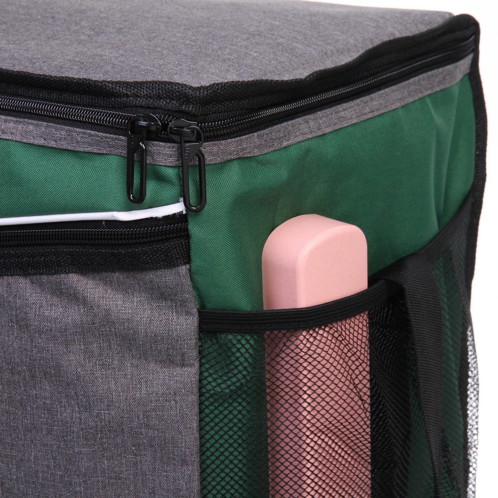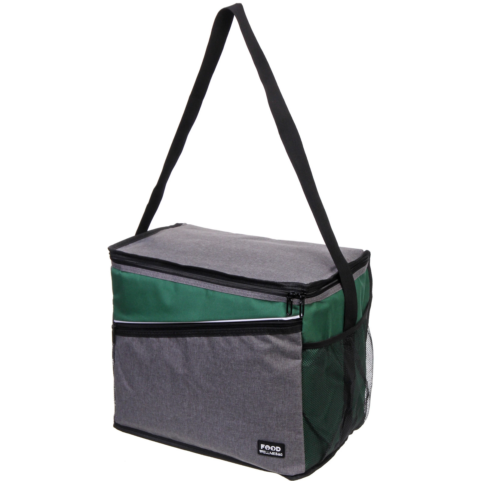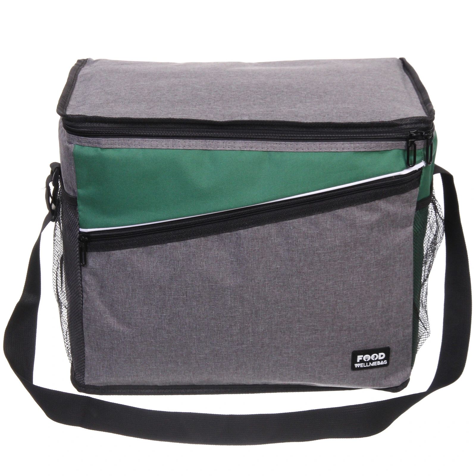 Прямоугольная форма и размер 40х25х32 см позволяют удобно разместить контейнеры с едой, бутылки и упаковки. Основное отделение закрывается на молнию с двумя бегунками — так проще открывать сумку с любой стороны. Дополнительный передний карман на молнии подойдёт для столовых приборов, салфеток и мелочей, а боковые сетчатые карманы удобны для бутылок или аксессуаров.