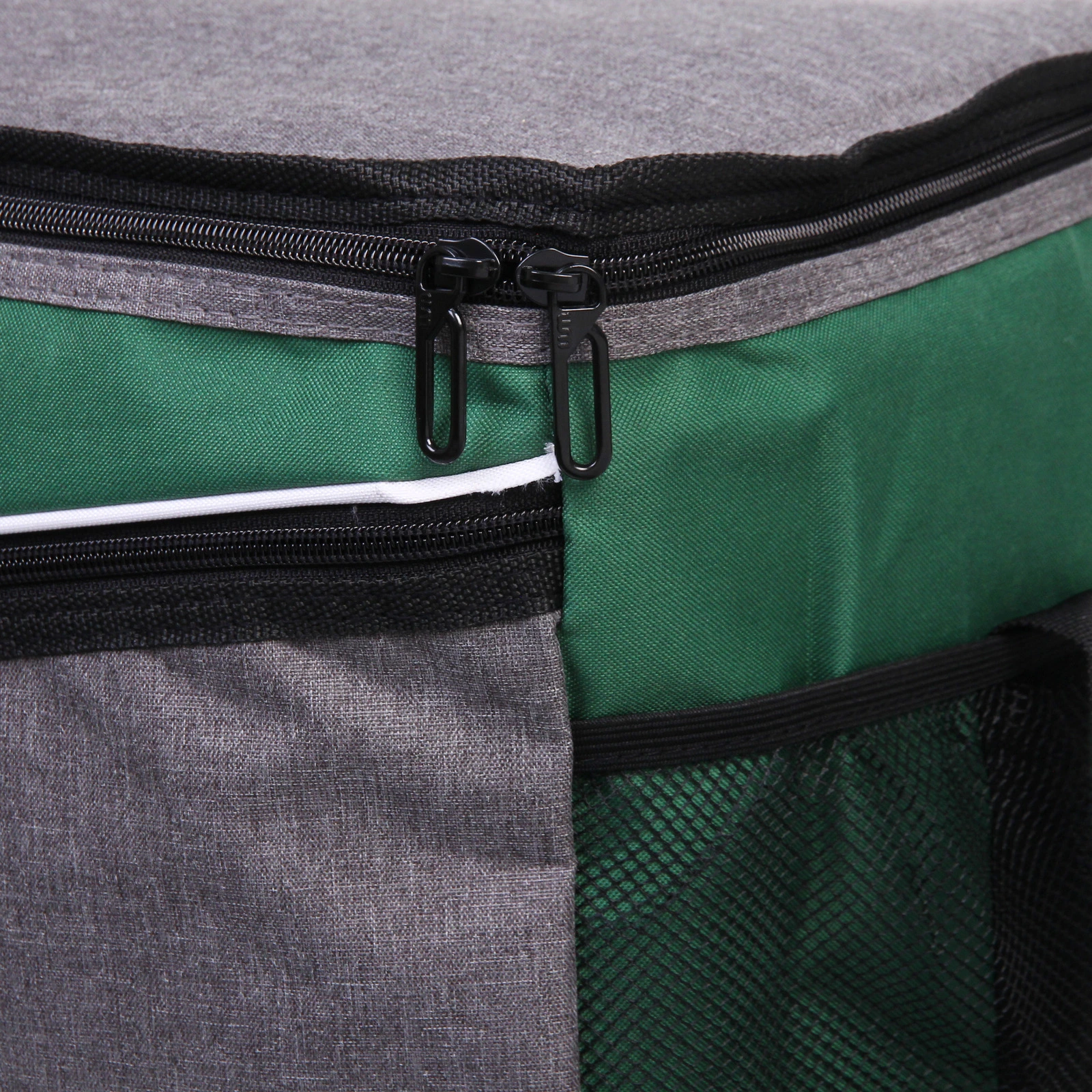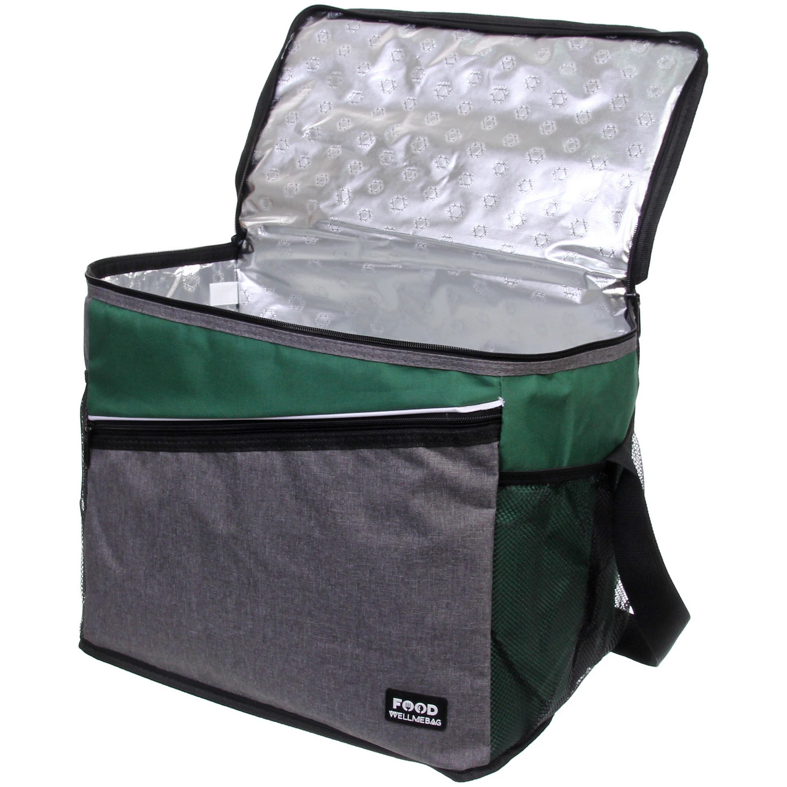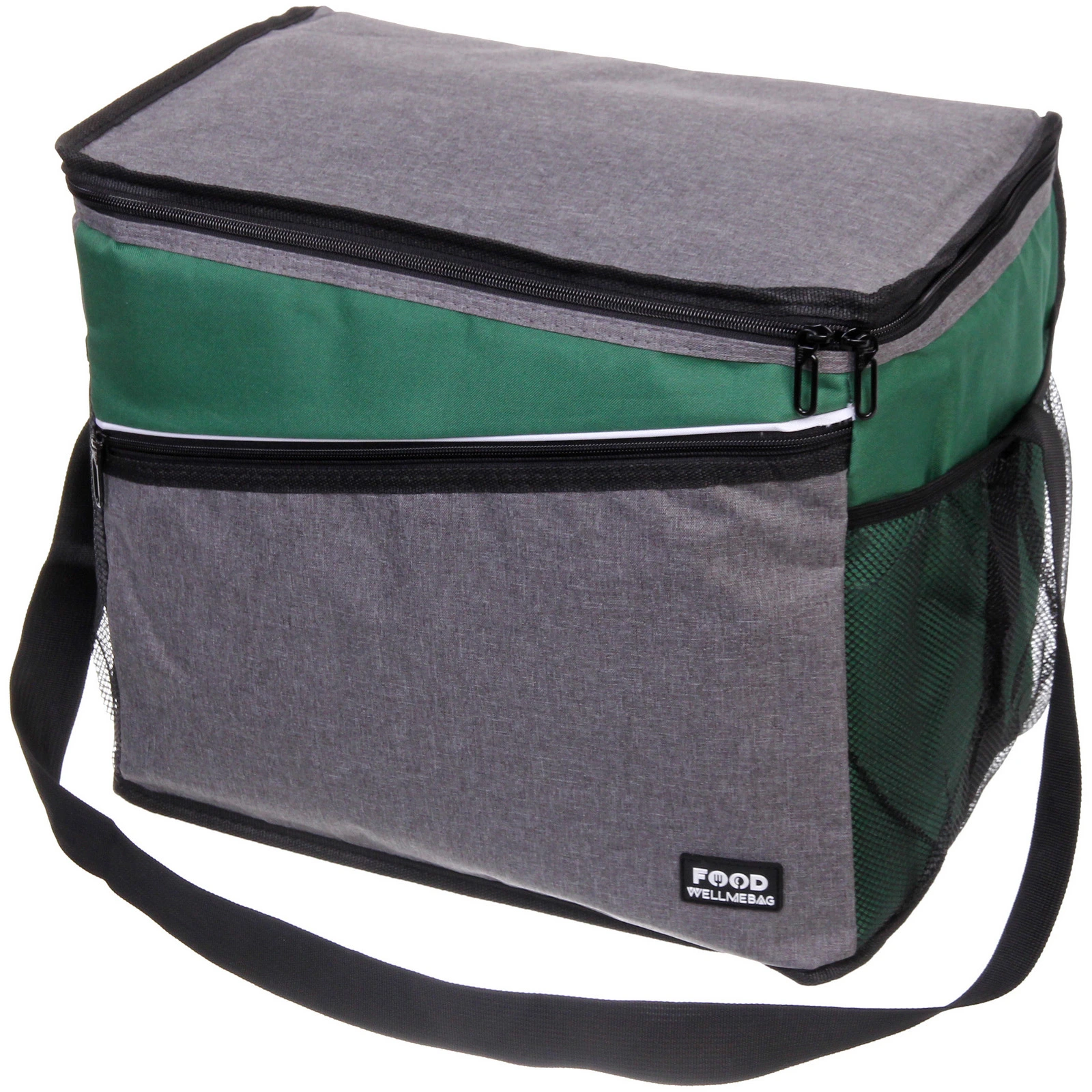 Прямоугольная форма и размер 40х25х32 см позволяют удобно разместить контейнеры с едой, бутылки и упаковки. Основное отделение закрывается на молнию с двумя бегунками — так проще открывать сумку с любой стороны. Дополнительный передний карман на молнии подойдёт для столовых приборов, салфеток и мелочей, а боковые сетчатые карманы удобны для бутылок или аксессуаров.