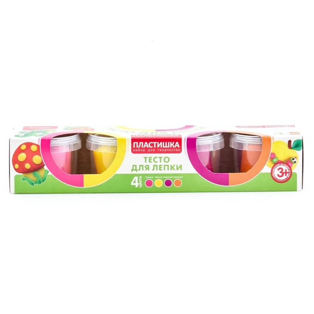 Набор включает в себя четыре баночки с тестом разных цветов. разноцветный принт: розовый, жёлтый, оранжевый, красный. Отгружается один набор, конкретный цветовой состав определяется случайным образом. Каждая порция теста хранится в индивидуальной прозрачной пластиковой баночке с плотной белой крышкой, что обеспечивает его сохранность и защищает от высыхания. Удобная картонная упаковка с прозрачными окошками позволяет сразу увидеть содержимое и станет отличным вариантом для подарка.