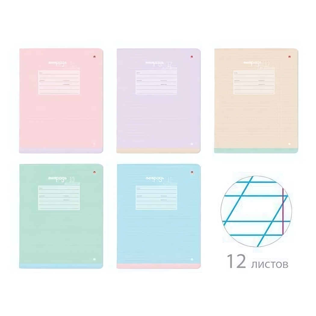 Каждая тетрадь содержит 12 листов (24 страницы) с местом для подписи на обложке. Пастельная палитра включает нежно-розовый, мятный, лавандовый и персиковый оттенки. Безопасные материалы соответствуют требованиям для детских канцелярских товаров.