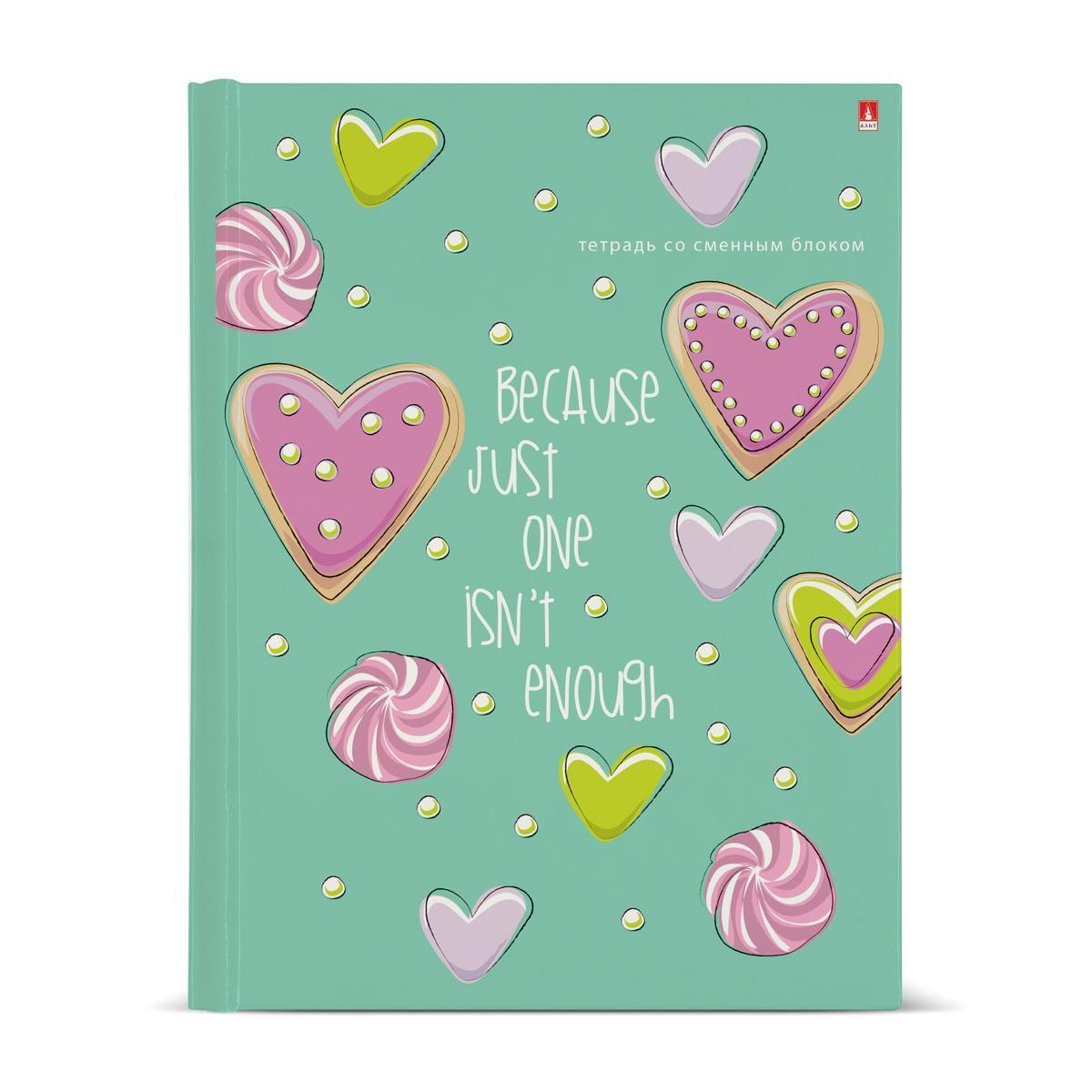 Эта тетрадь на кольцах со сменным блоком станет вашим незаменимым помощником в учебе, работе и творчестве. Обложка с милым дизайном 'Сладкое настроение' подарит позитивные эмоции и вдохновит на новые свершения. Мятный цвет и яркие сердечки создают игривое настроение, а надпись 'BECAUSE JUST ONE ISN'T ENOUGH' намекает на безграничные возможности для записей и идей.