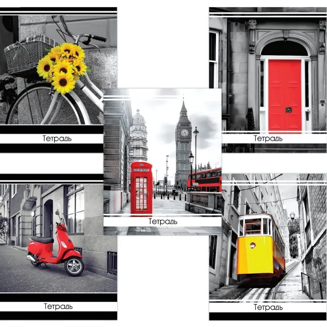 Важно: тетради представлены в ассортименте с различными дизайнами - велосипед, телефонная будка, Биг-Бен и другие узнаваемые образы в черно-белой гамме с яркими акцентами.