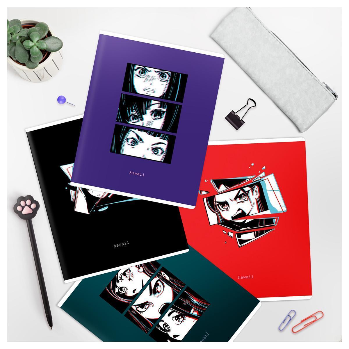 Цветовая гамма обложек (фиолетовый, черный, красный, зеленый) позволяет подобрать вариант под настроение. Дизайн с персонажами Kawaii создаёт позитивную атмосферу для работы и творчества.