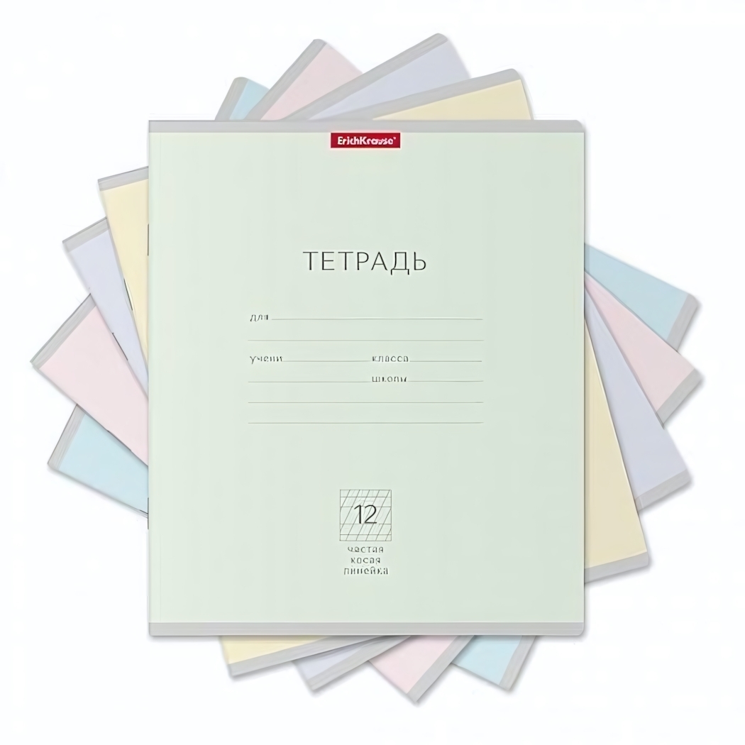 Тетрадь содержит 12 листов, скрепленных металлической скобой. Скругленные уголки обложки и блока предотвращают деформацию. Цветовая гамма представлена в pastel-оттенках без возможности выбора конкретного цвета.