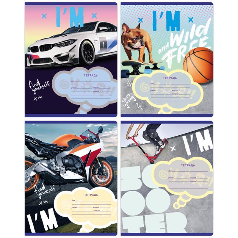 Тетрадь содержит 12 листов в клетку с белизной 90%. Специальные поля на обложке позволяют указать имя, класс и предмет. Доступны различные дизайны: от спортивных машин до милых животных.