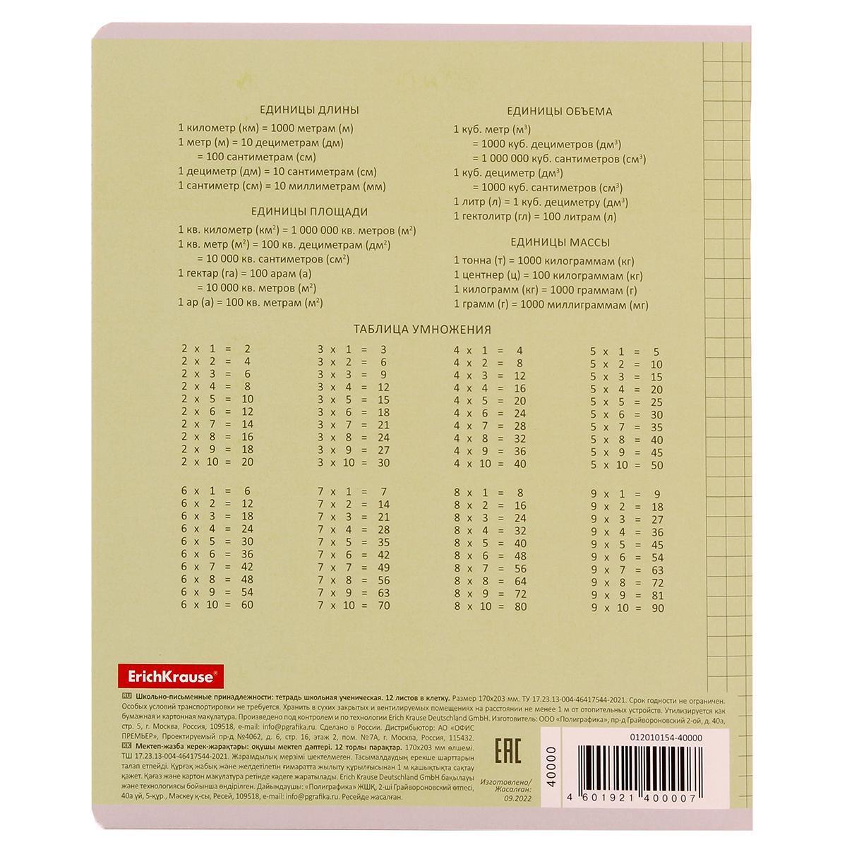 Белизна бумаги 100% снижает нагрузку на зрение, а оптимальная плотность 60 г/м² предотвращает просвечивание чернил. На задней обложке размещена таблица умножения и справочные материалы по единицам измерения — всегда под рукой нужная информация.