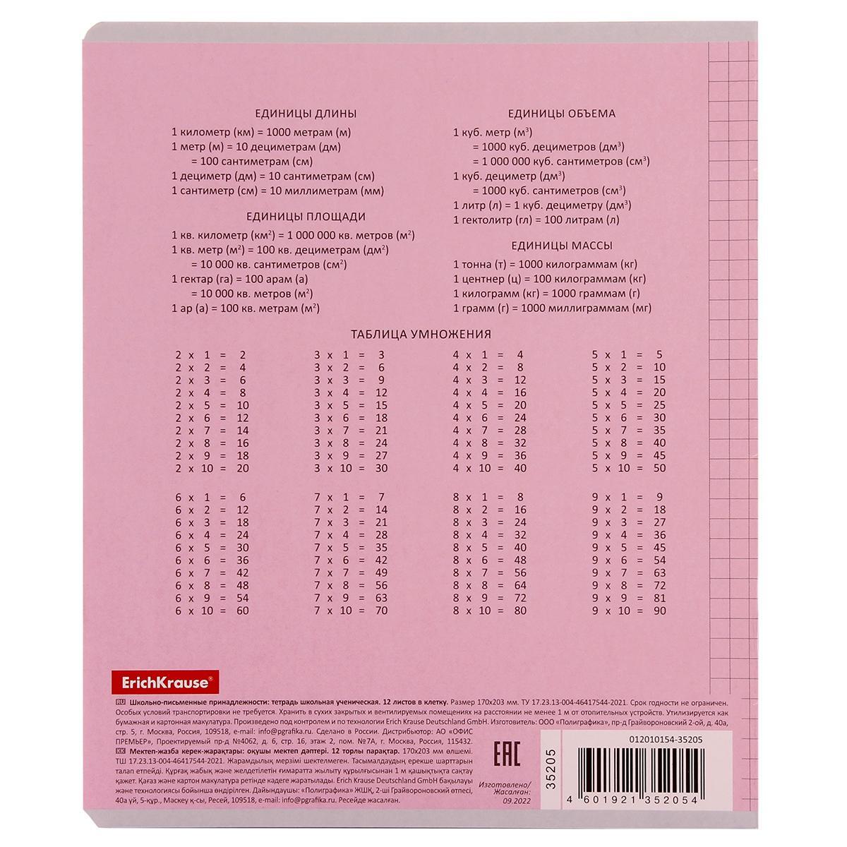Блок из 12 листов (плотность 60 г/м2) скреплен прочной металлической скобой. На задней обложке расположены полезные справочные материалы: таблица умножения и единицы измерения.