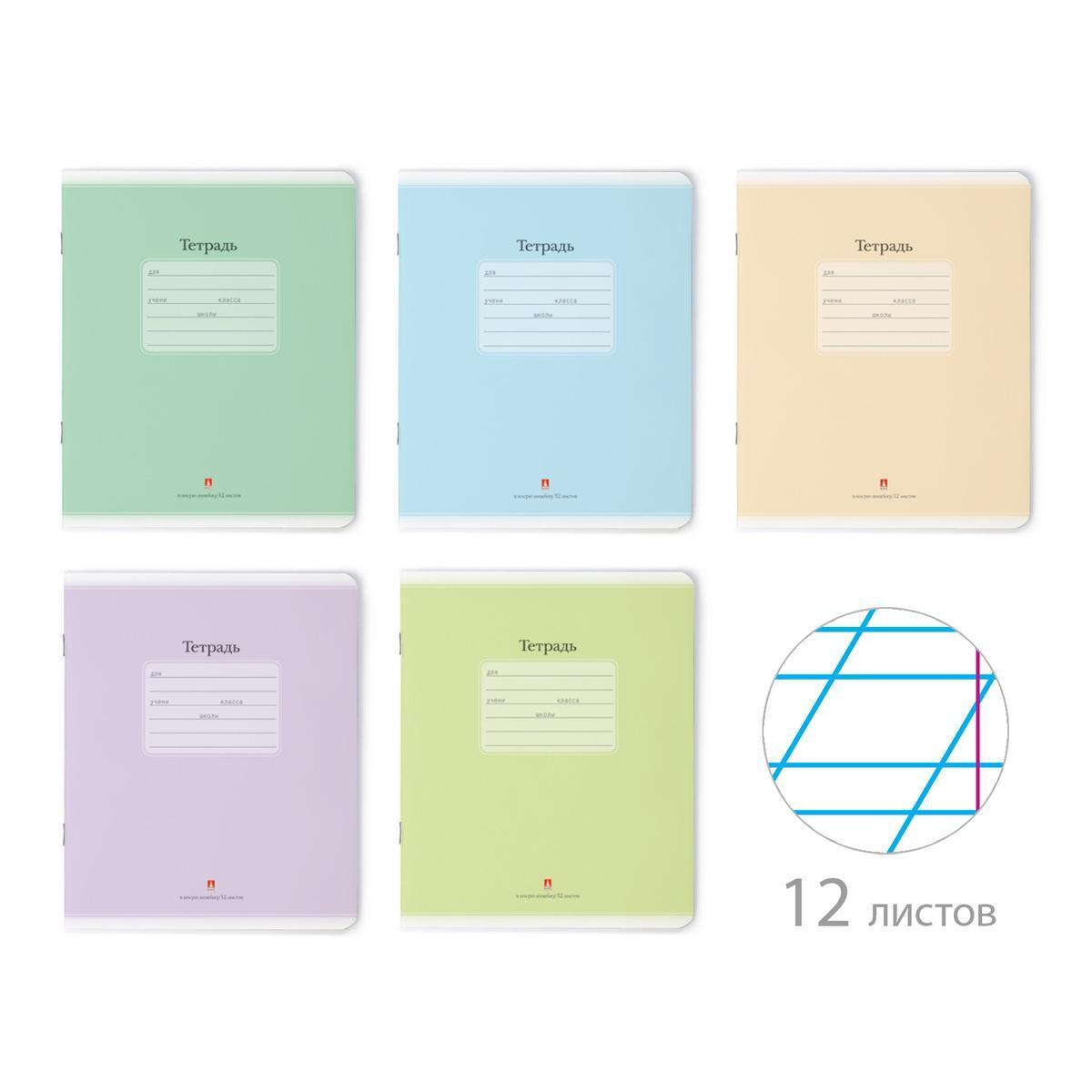 Подходит для ежедневного использования в школе. Косая линейка помогает детям правильно формировать почерк. В комплекте 5 тетрадей разных цветов: зеленый, бежевый, лимонный, фиолетовый и голубой.