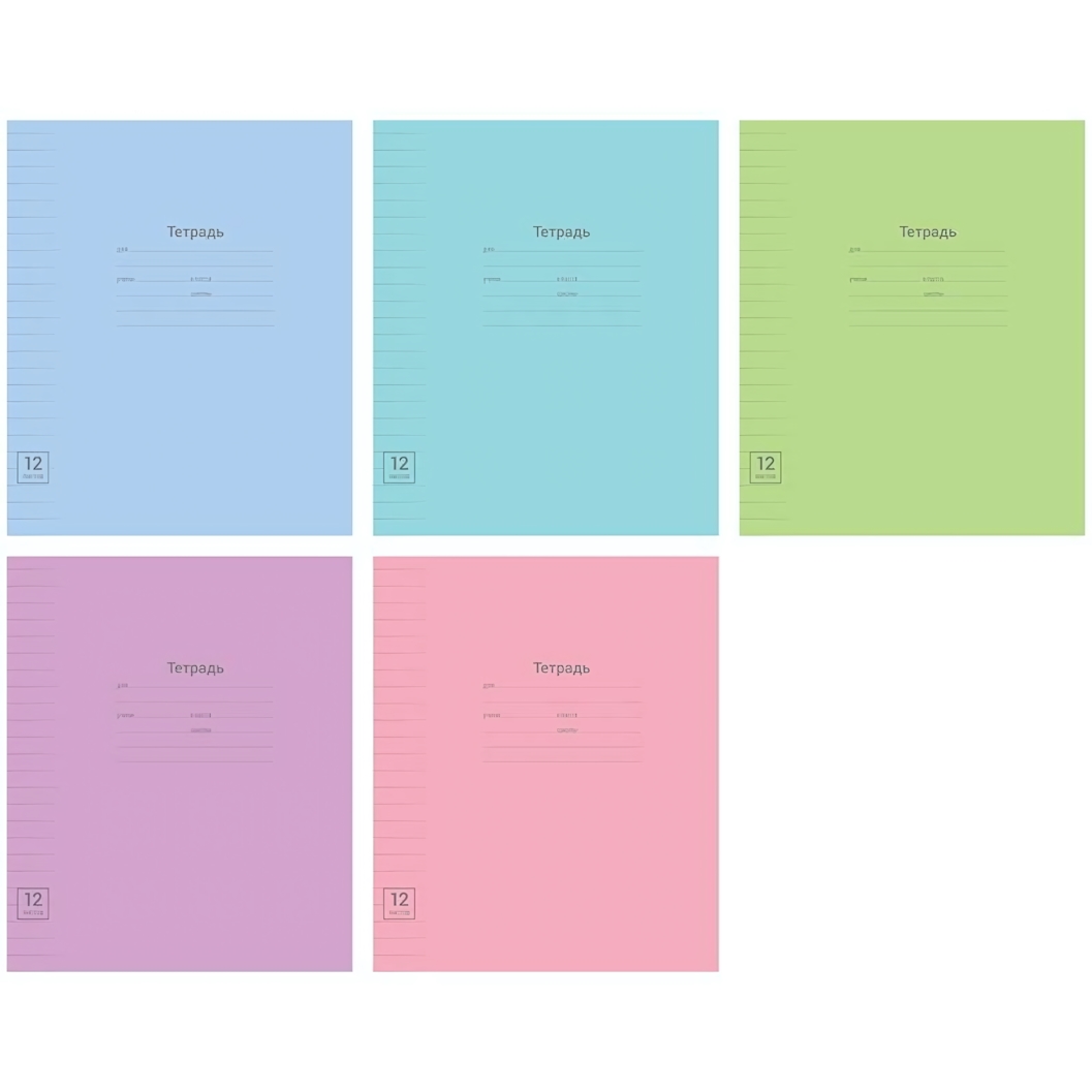 На обложке предусмотрены поля для заполнения: "для", "ученик", "класс", "предмет". Внутренний блок содержит 12 листов с линовкой. Представлены пять приятных пастельных оттенков: светло-голубой, зеленый, светло-розовый, светло-сиреневый и светло-зеленый.