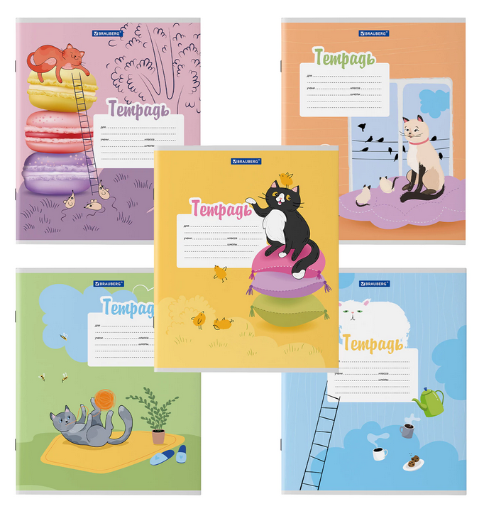 Обложка выполнена из плотного мелованного картона с яркими иллюстрациями котов. Доступны разные варианты оформления: от нежных пастельных до более насыщенных оттенков. Отгружается одна тетрадь, дизайн определяется случайным образом, без возможности выбора.