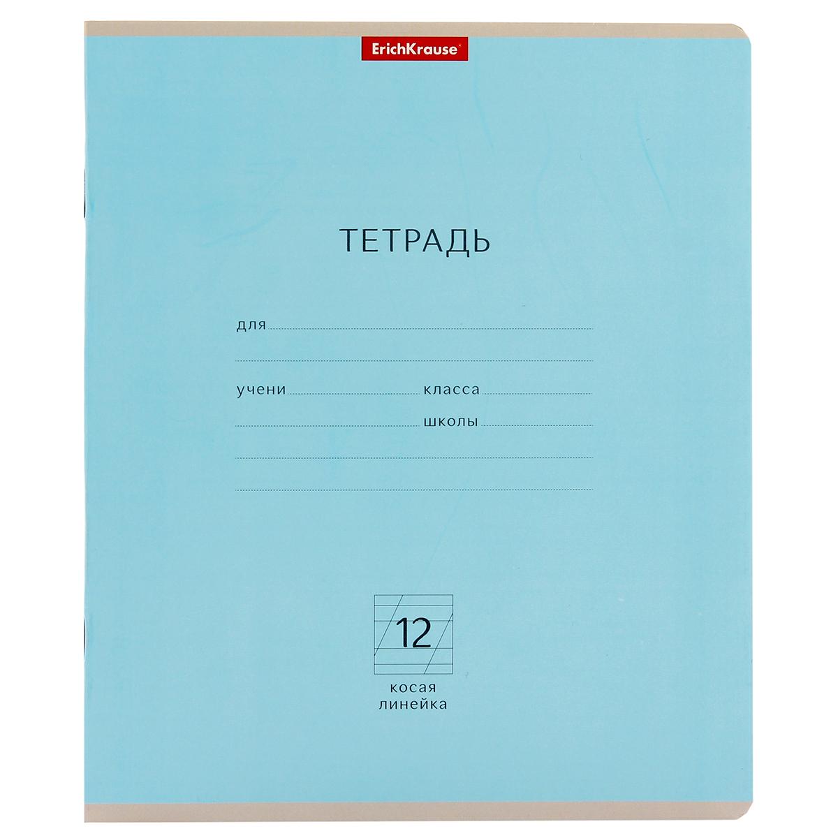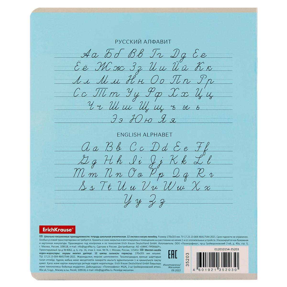 Тетрадь школьная А5 12л с косой линейкой и алфавитом, мелованный картон, скругленные углы, голубая