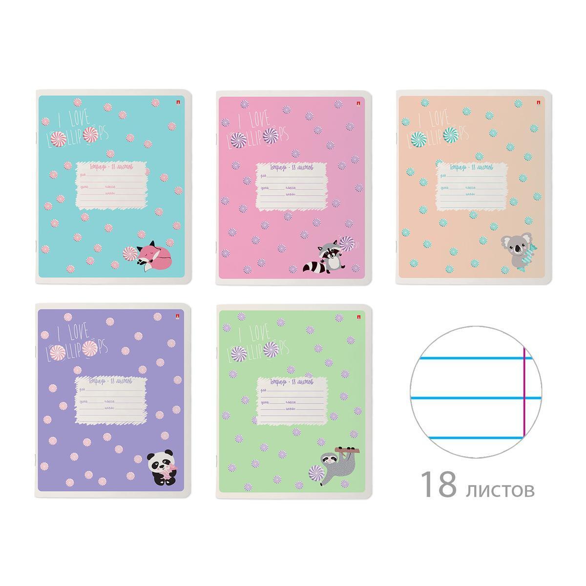 Тетрадь A5 18 листов в линию "Lollipop", милые зверята, 5 дизайнов