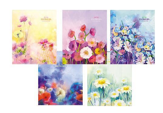 Обложка украшена полноцветной печатью с плавными линиями и романтичными цветочными мотивами. Внутренний блок скреплен металлическими скобами, что гарантирует долговечность. Тетрадь представлена в пяти вариантах дизайна: желтом, розовом, синем, фиолетовом и зеленом.