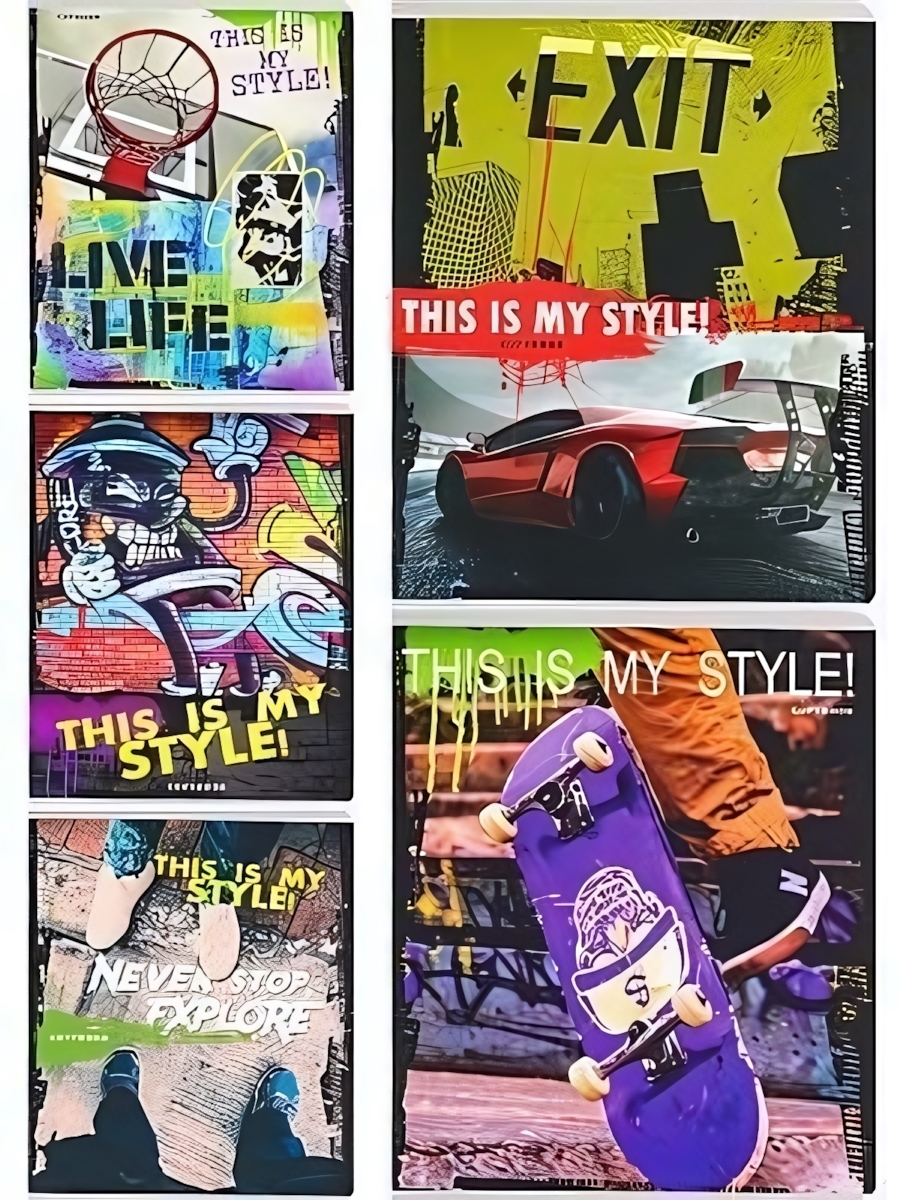 Тетрадь с динамичным дизайном станет вашим надежным спутником в мире знаний и творчества. Ультрамодные принты с элементами уличной культуры подчеркнут индивидуальность и добавят мотивации к занятиям.
