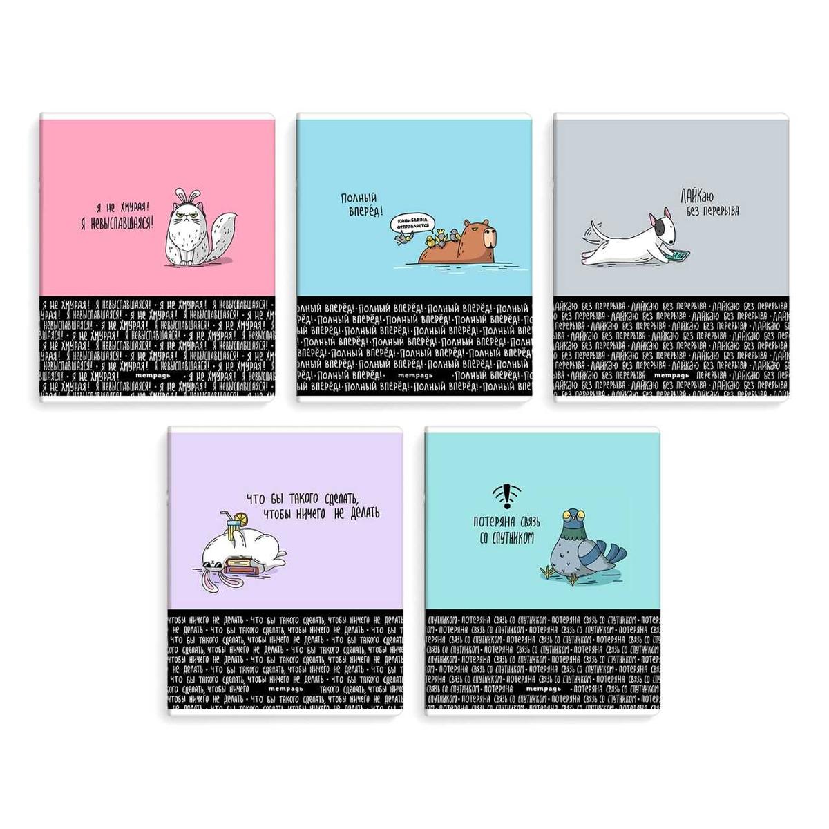 Тетрадь представлена в варианте «разноцветный принт». Каждое оформление несет в себе уникальный сюжет, который подчеркивает индивидуальность владельца. Качественная бумага внутреннего блока подходит для использования шариковых, гелевых и капиллярных ручек, обеспечивая комфортное письмо без просвечивания чернил на оборотной стороне листа.