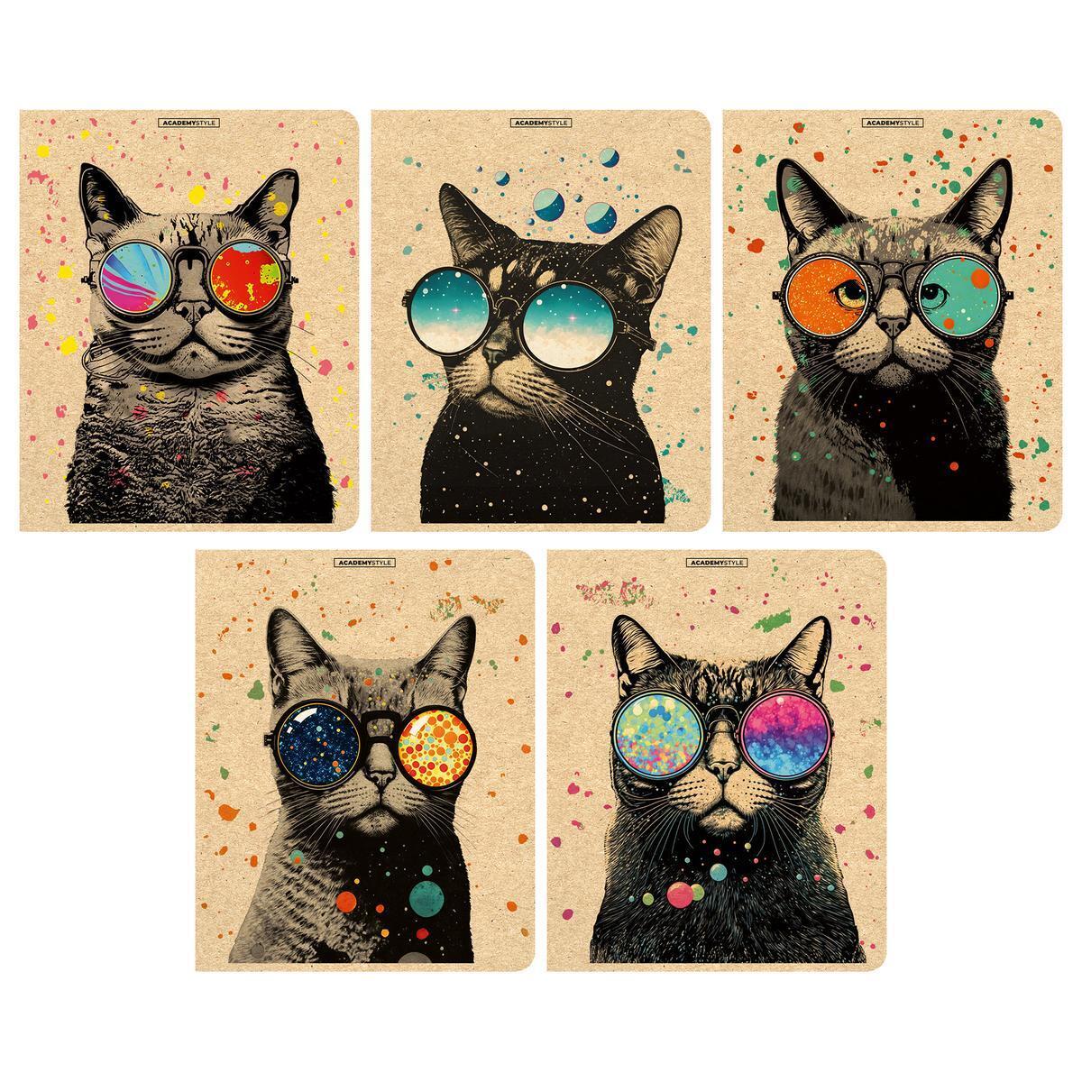 Тетрадь A5, 48 листов в клетку, серия "Коты в очках", крафт-дизайн, для школы и офиса
