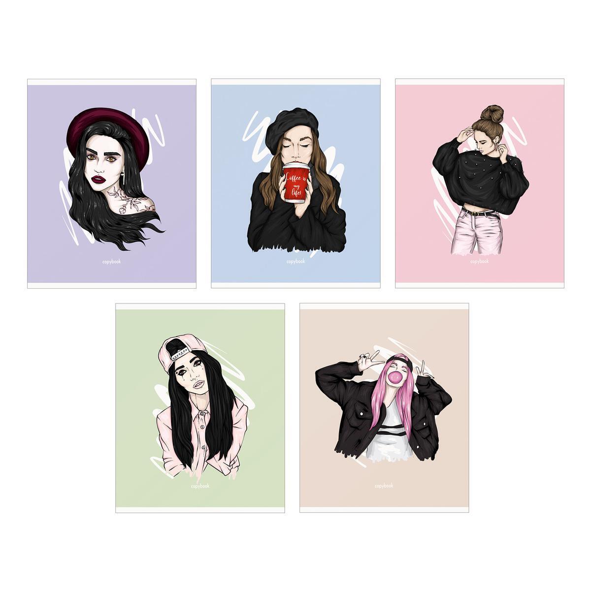 Тетрадь с уникальными иллюстрациями станет верным спутником творческих занятий и школьных уроков. 5 разных девушек в модных образах на цветных фонах создают настроение и помогают выделиться среди сверстников.