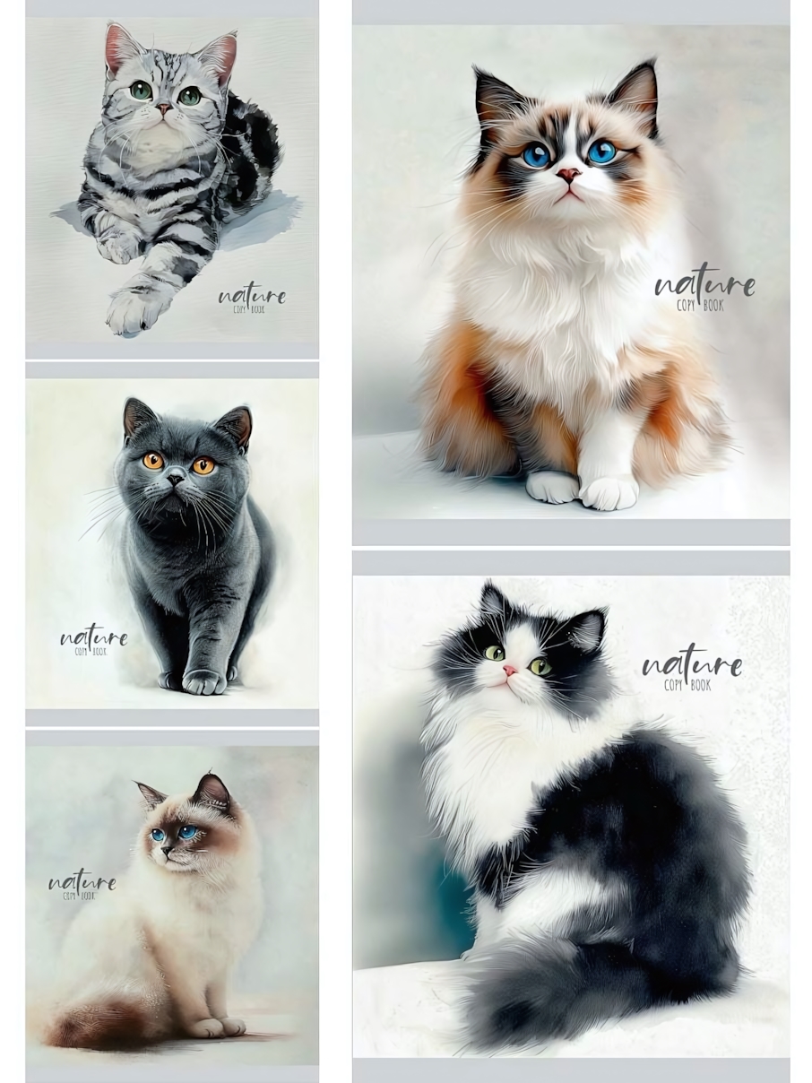 Коллекция "Красивые коты-1" выполнена в светлых тонах с акцентом на природную грацию домашних питомцев. Обратите внимание: товар продается поштучно и представлен в ассортименте. Каждое изделие украшено разноцветным принтом с изображением одного из пяти очаровательных котов и дополнено стильной надписью "nature COPY BOOK". Это отличный выбор для школьников, студентов и всех, кто ценит качественную и красивую канцелярию.