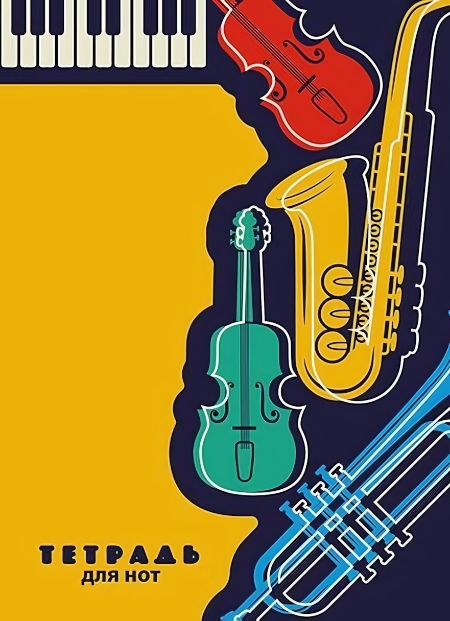 - Яркий дизайн: Обложка с музыкальными инструментами – для вдохновения и хорошего настроения.