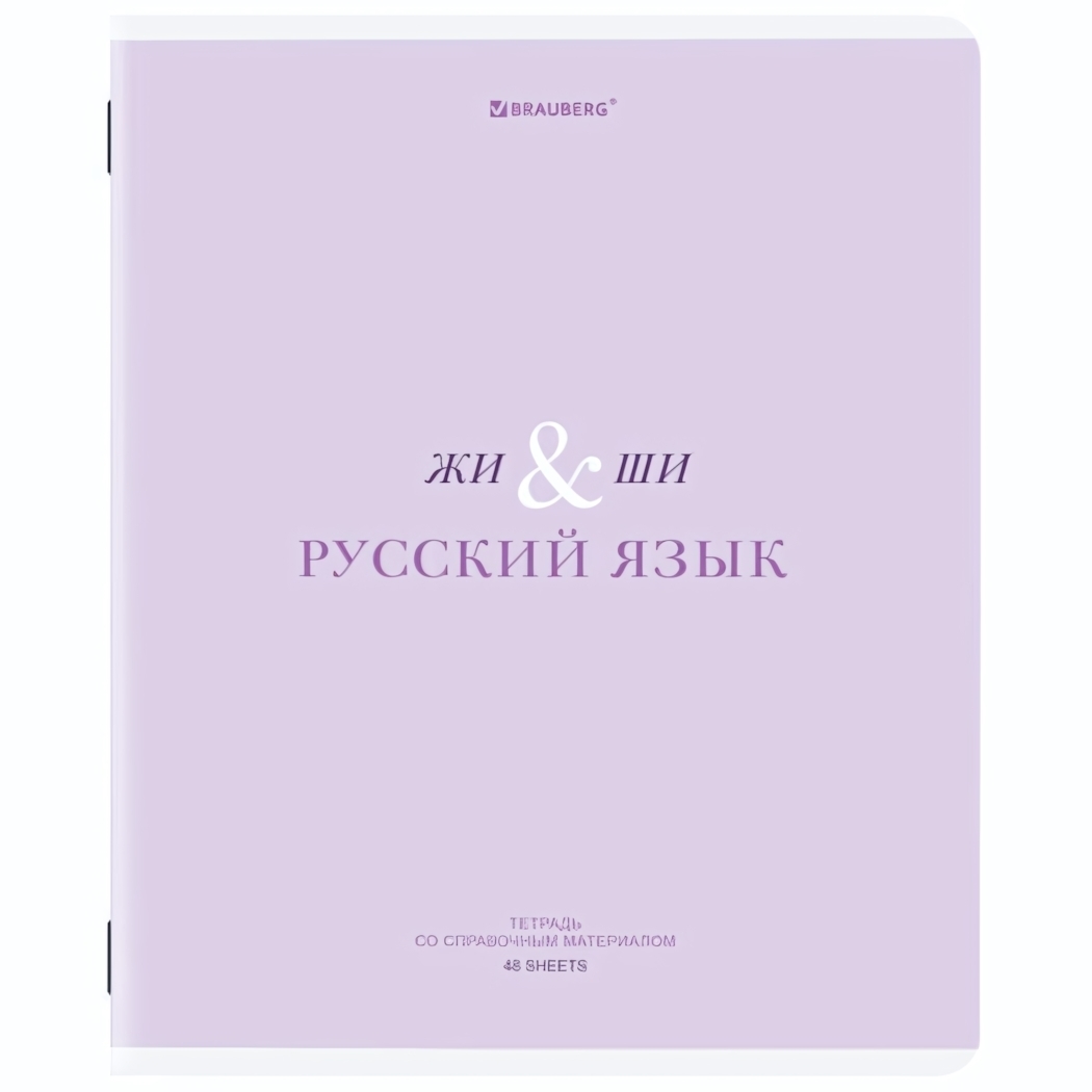 Тетрадь скреплена надёжными скобами, что обеспечивает быстрый доступ к любой странице без риска выпадения листов. На обложке крупным шрифтом указано назначение – «Русский язык», а фирменный логотип BRAUBERG подтверждает высокие стандарты качества.