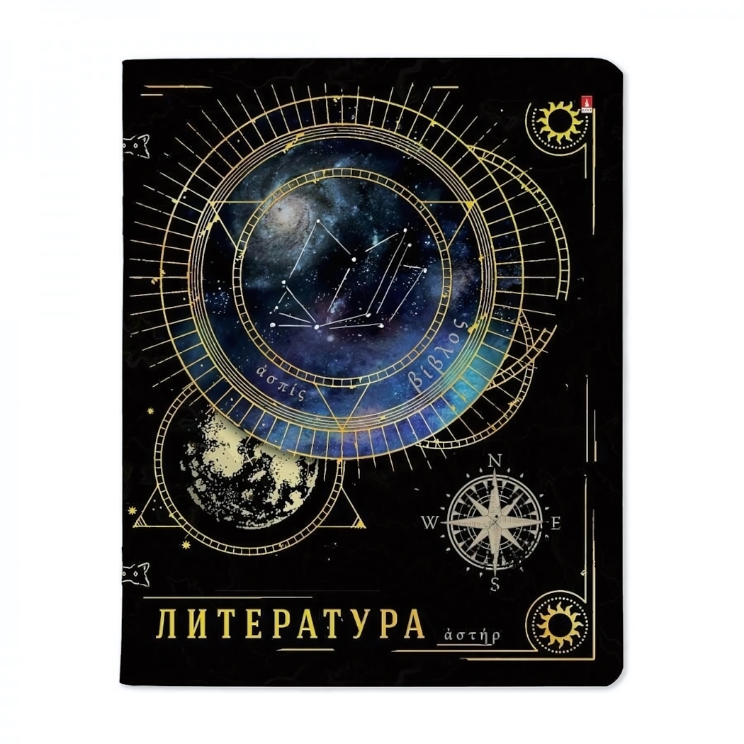 Размер тетради составляет А5, что делает ее компактной и удобной для переноски в рюкзаке. Обложка черного цвета с золотыми и синими элементами дизайна, изображениями космоса и навигационными символами, такими как компас, добавляет оригинальности и вдохновения для учебы.