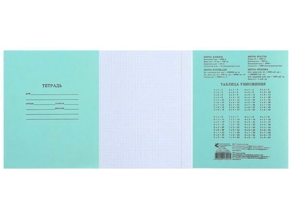 На задней стороне обложки вы найдете полезные таблицы с мерами длины, массы и объема. Также представлена таблица умножения — отличный бонус для младших школьников.