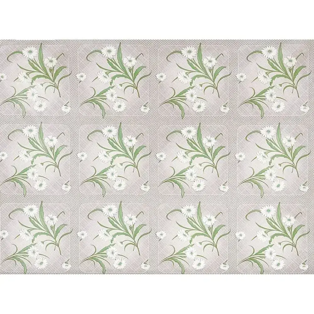 На светло-сером фоне располагаются изящные квадраты с рисунком зелёных листьев и белых цветов. Фрагменты отделены тонкой рамкой и размещены в сетке: 3 ряда по 5 квадратиков. Такой узор делает клеёнку эффектным дополнением к любому интерьеру, придаёт столу особую привлекательность и аккуратный вид.
