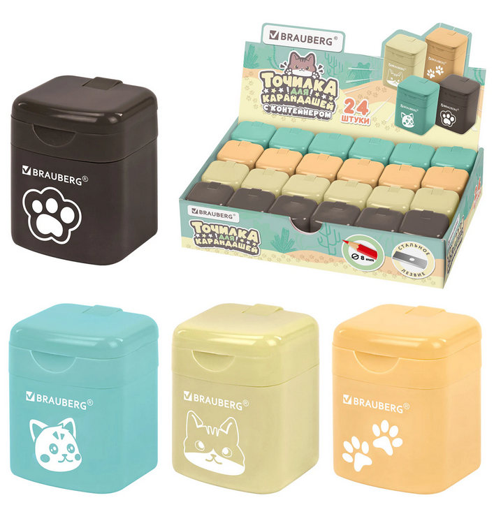 Точилка 1отв. пластик. с контейнером, кросс-серия "Милые коты" цвета ассорти (BRAUBERG)