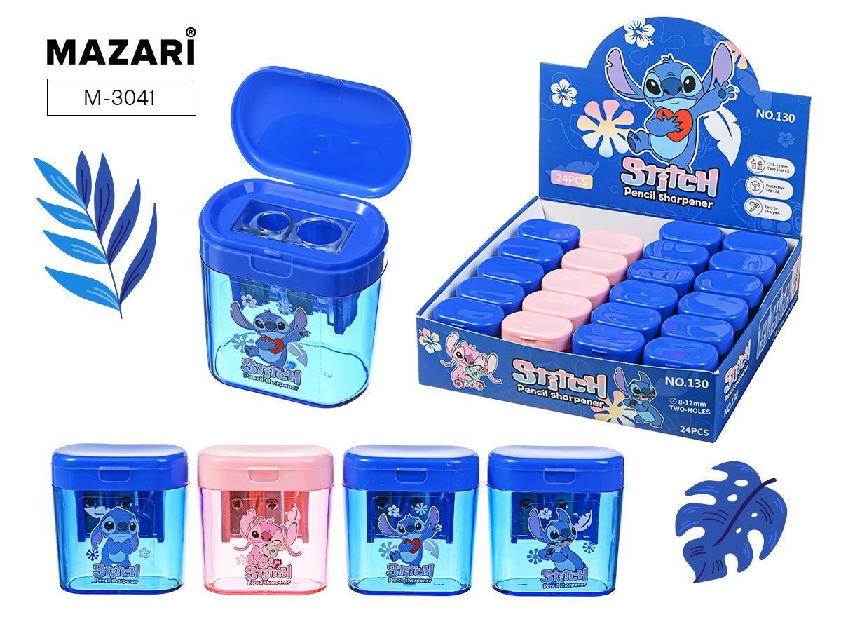 Материал: пластик, прозрачный корпус, крышка в синем или розовом цвете. Два отверстия для карандашей диаметром 8‑12 мм. В комплекте – встроенный контейнер для стружки и картонный дисплей.
