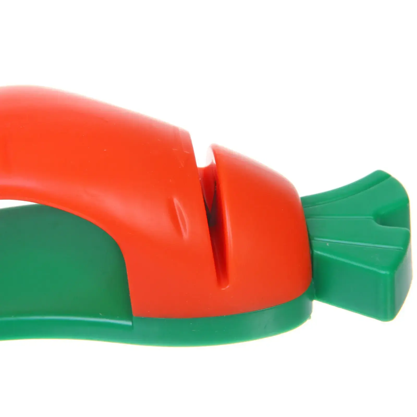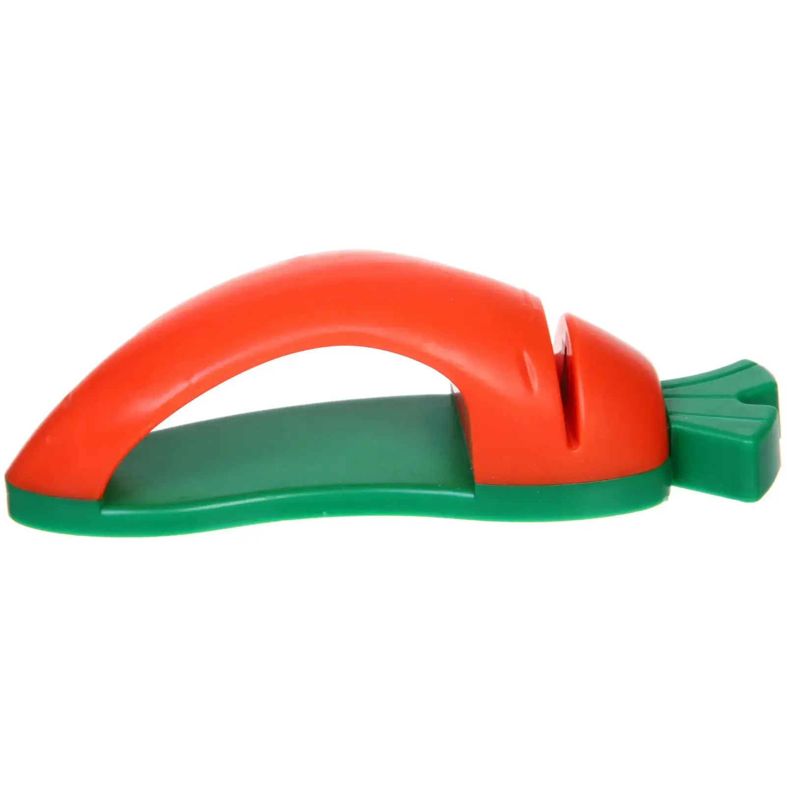 Размер точилки составляет 16,5 см, что делает её компактной и удобной для хранения. Она выполнена из прочного металла и керамики, а также имеет пластиковые элементы, что обеспечивает легкость и надежность. Яркий дизайн в форме морковки добавляет нотку веселья на вашу кухню.